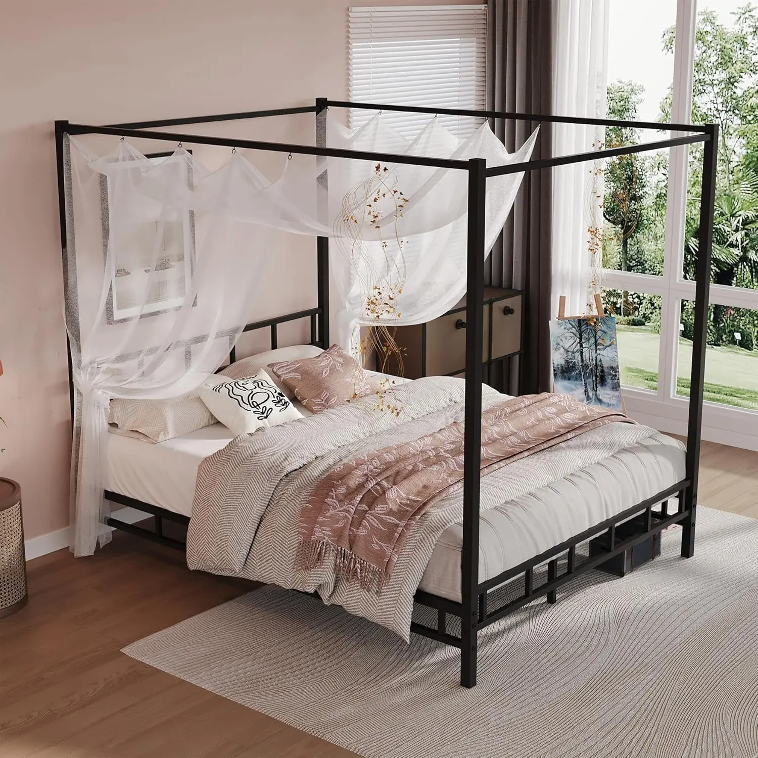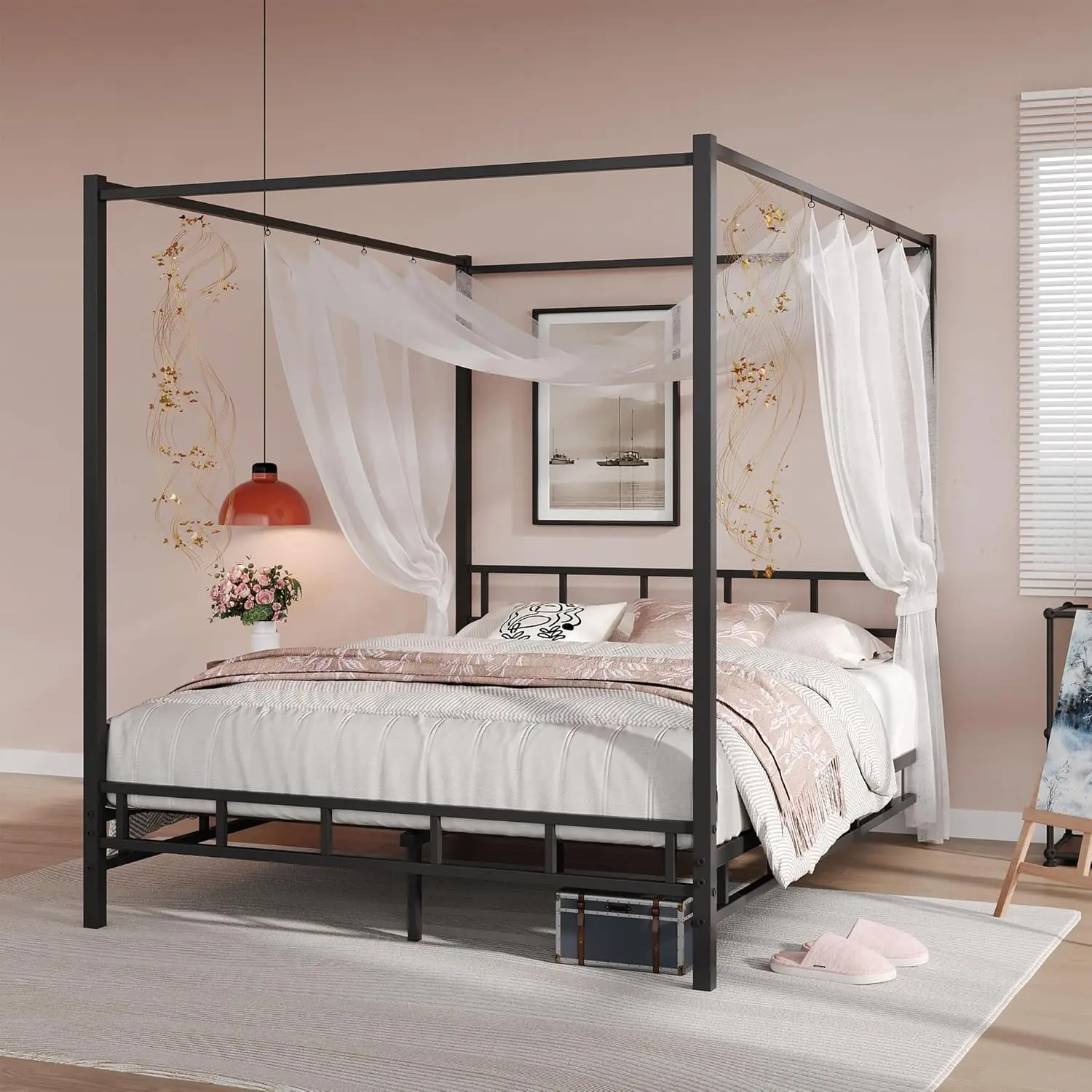 ·Create a Dream Space: Canopy bed frame is not only a bed, but also a great decoration. You can choose curtains of different colors and materials according to your preferences, from light and flowing gauze to heavy and luxurious velvet, which can be perfectly matched with the bed.