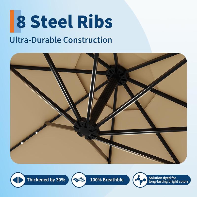 ·Large Shade Area: Covers an impressive 78 sq. ft., perfect for tables sized 47"-59" and accommodating 6-8 chairs, supported by a sturdy 1.9" thick alloy steel pole and 8 robust ribs for enhanced durability and wind resistance.