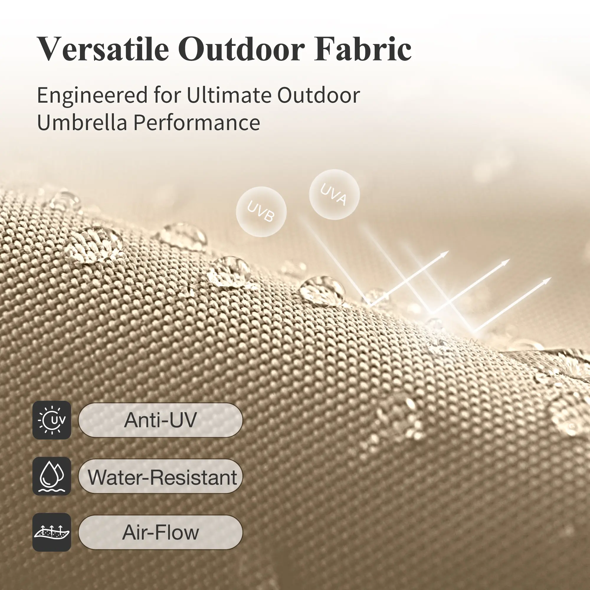 Hydraulic Opening Design: Unique design with Hydraulic Opening and 360-degree rotation for patio umbrella is flexible against all day’s sunlight, protects you from the sun, and keep you cool and comfortable