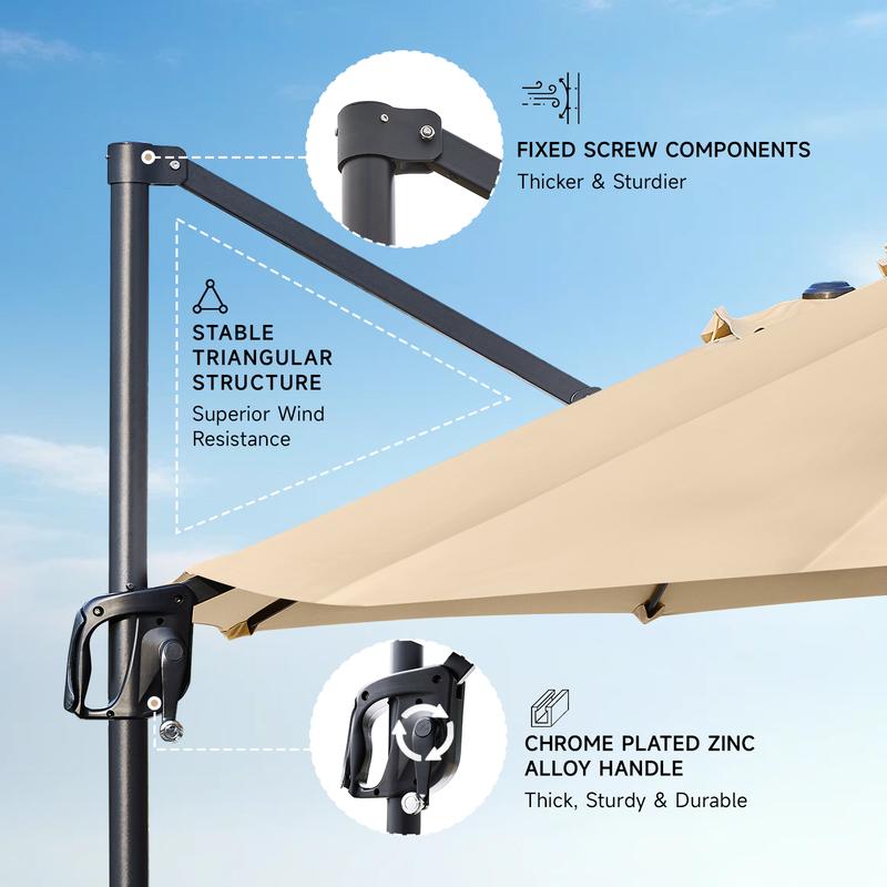 ·Free Height Adjustment for Optimal Shade: Say goodbye to limited preset angles! Unlike traditional five level height adjustable umbrella, our cantilevered patio umbrella features an innovative tension-free height adjustment system that can be seamlessly customized to block sunlight from any angle, ensuring perfect shade coverage and suitable for leisure, dining, or poolside relaxation