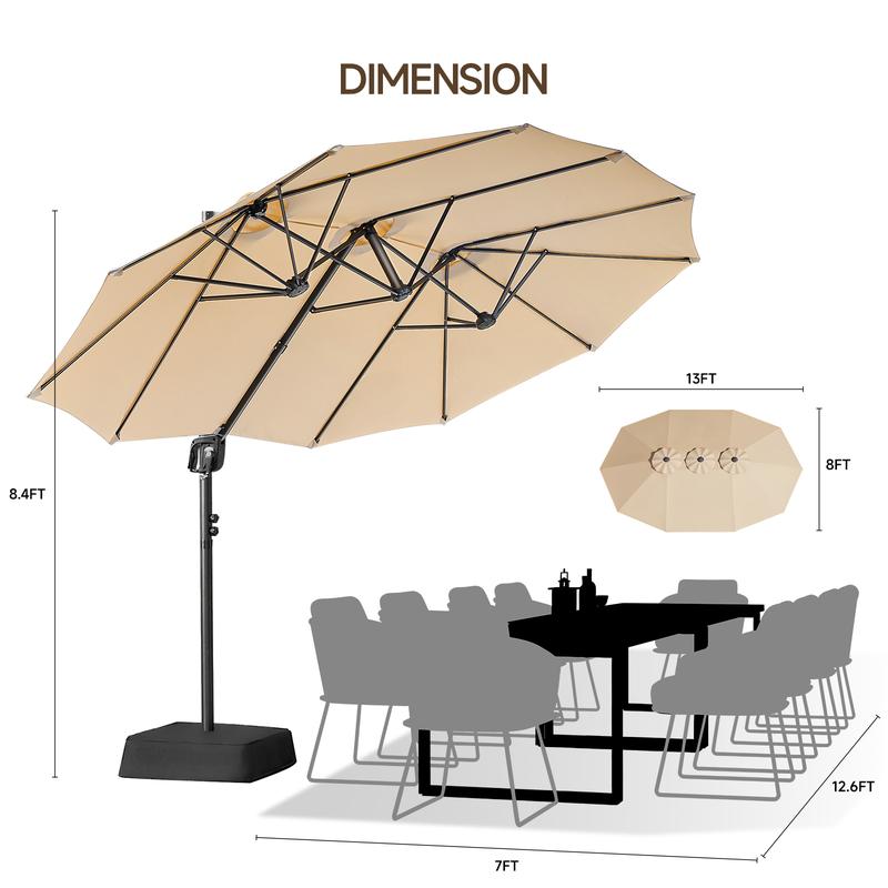 ·Massive 8x13ft Coverage: Enjoy the sunshine with our 8FT x 13FT large patio umbrella, which provides up to 104 square feet of spacious shade when fully opened and can accommodate 4-8 people or 4 lounge chairs. This 13ft double-sided outdoor umbrella is perfect for gatherings with family and friends, making it an ideal choice for both family and business occasions