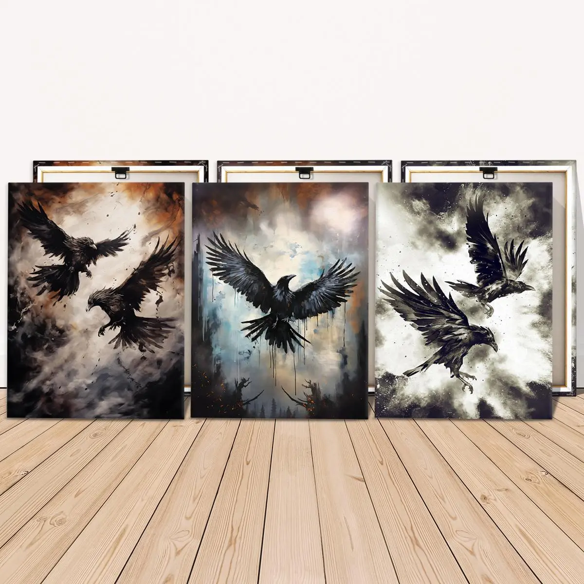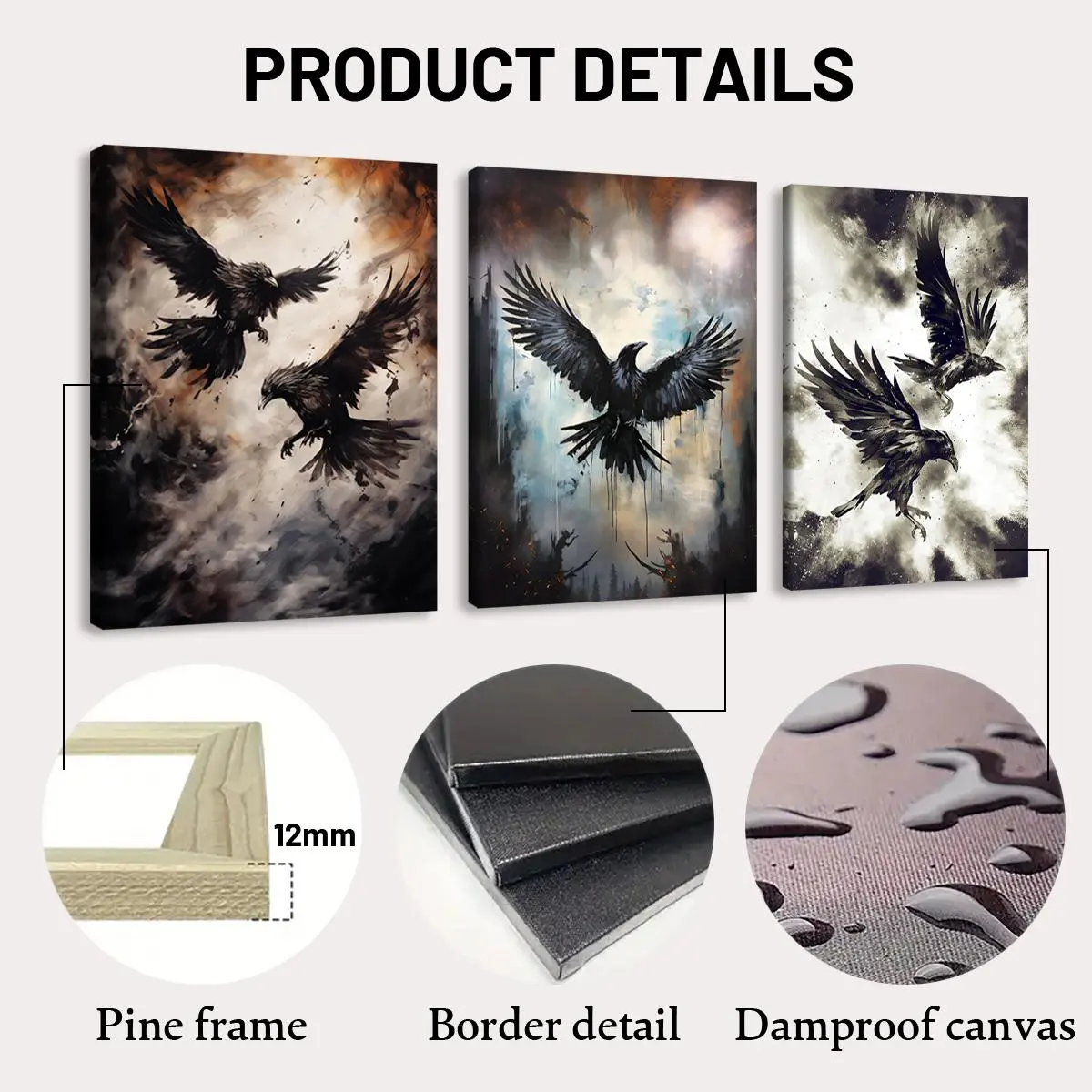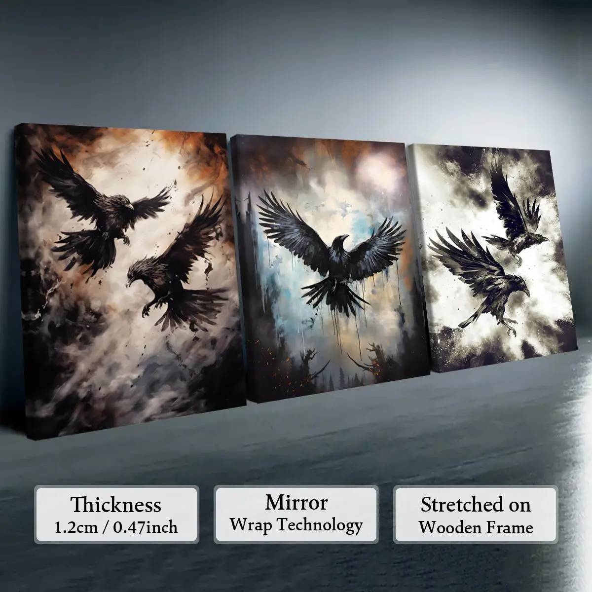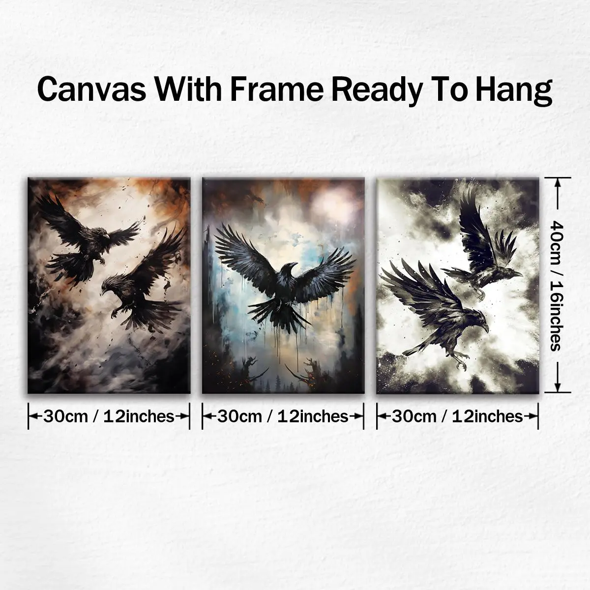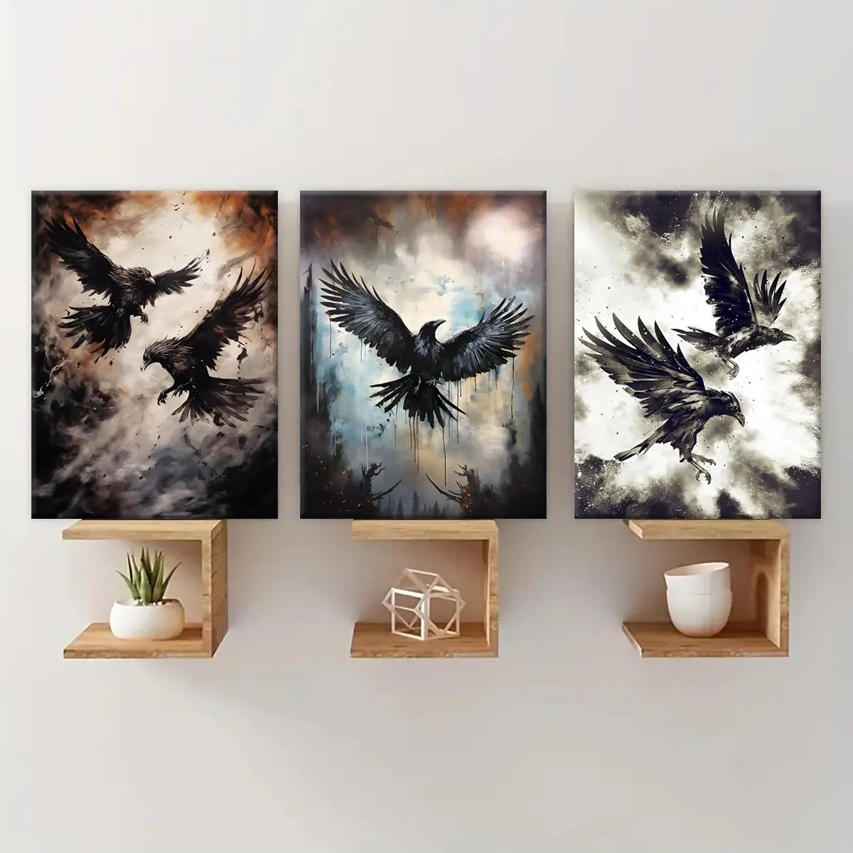 5. Creepy Crow Pattern Wooden Framed Canvas Painting Modern Art Design, 3 Counts/set Halloween Murals, Wall Art Decor for Home Living Room Bedroom Office