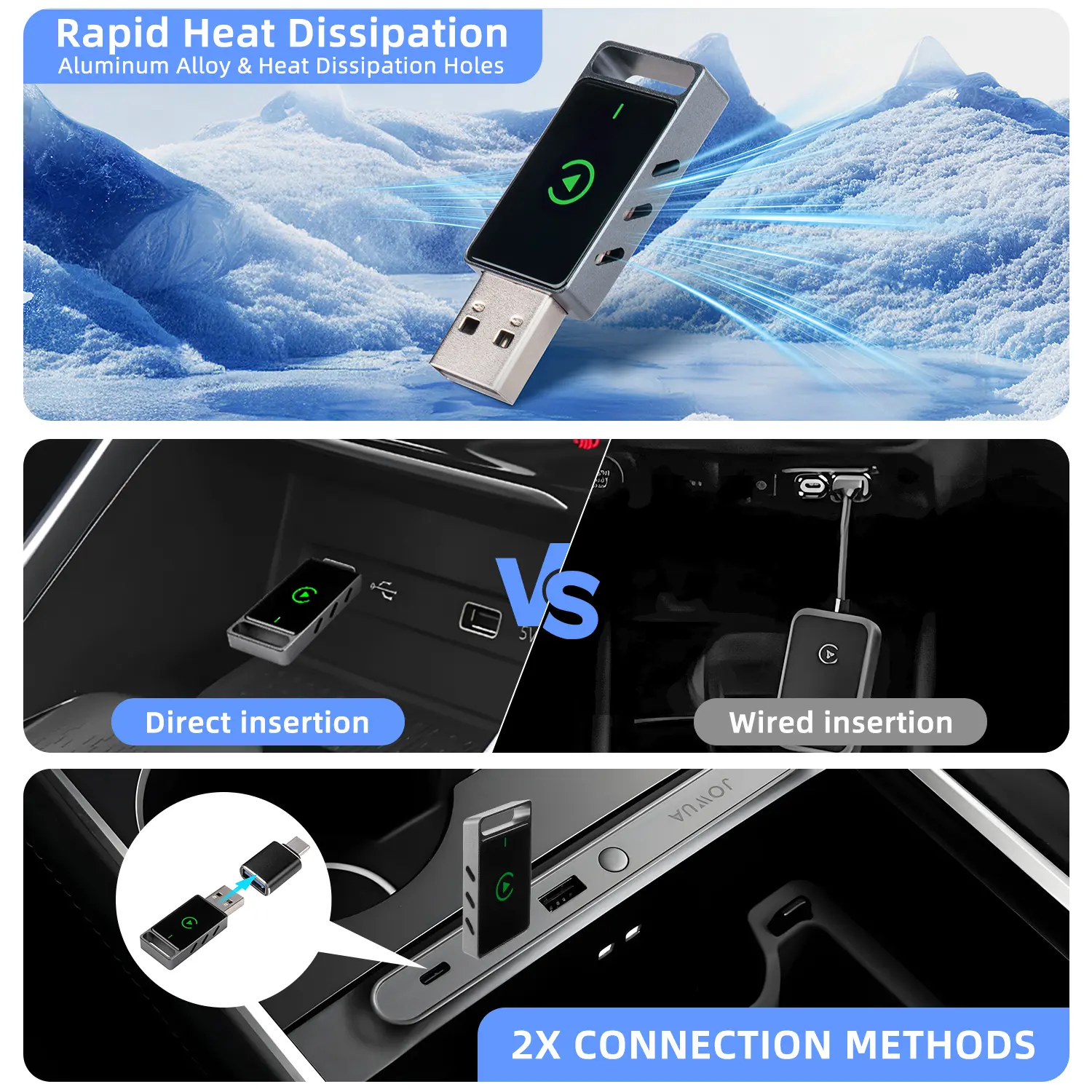 Focus on heat dissipation: Experience seamless connection with our wireless carplay adapter! It adopts an advanced side exhaust hole convection cooling design, which is more effective in heat dissipation than sealing devices. Say goodbye to overheating concerns during long commutes or demanding usage. This carplay wireless adapter maintains a reliable cool and stable temperature, ensuring absolute safety and continuous peak performance for your wireless carplay enjoyment.