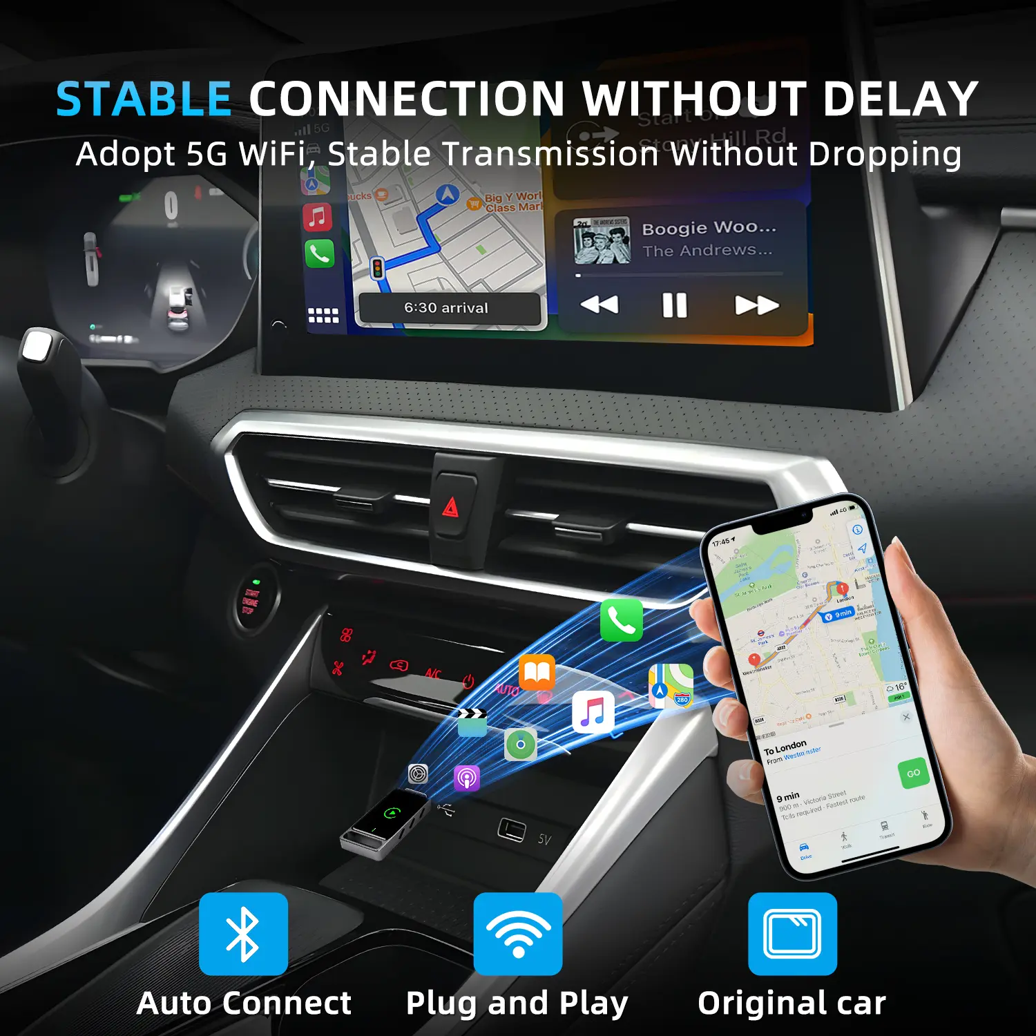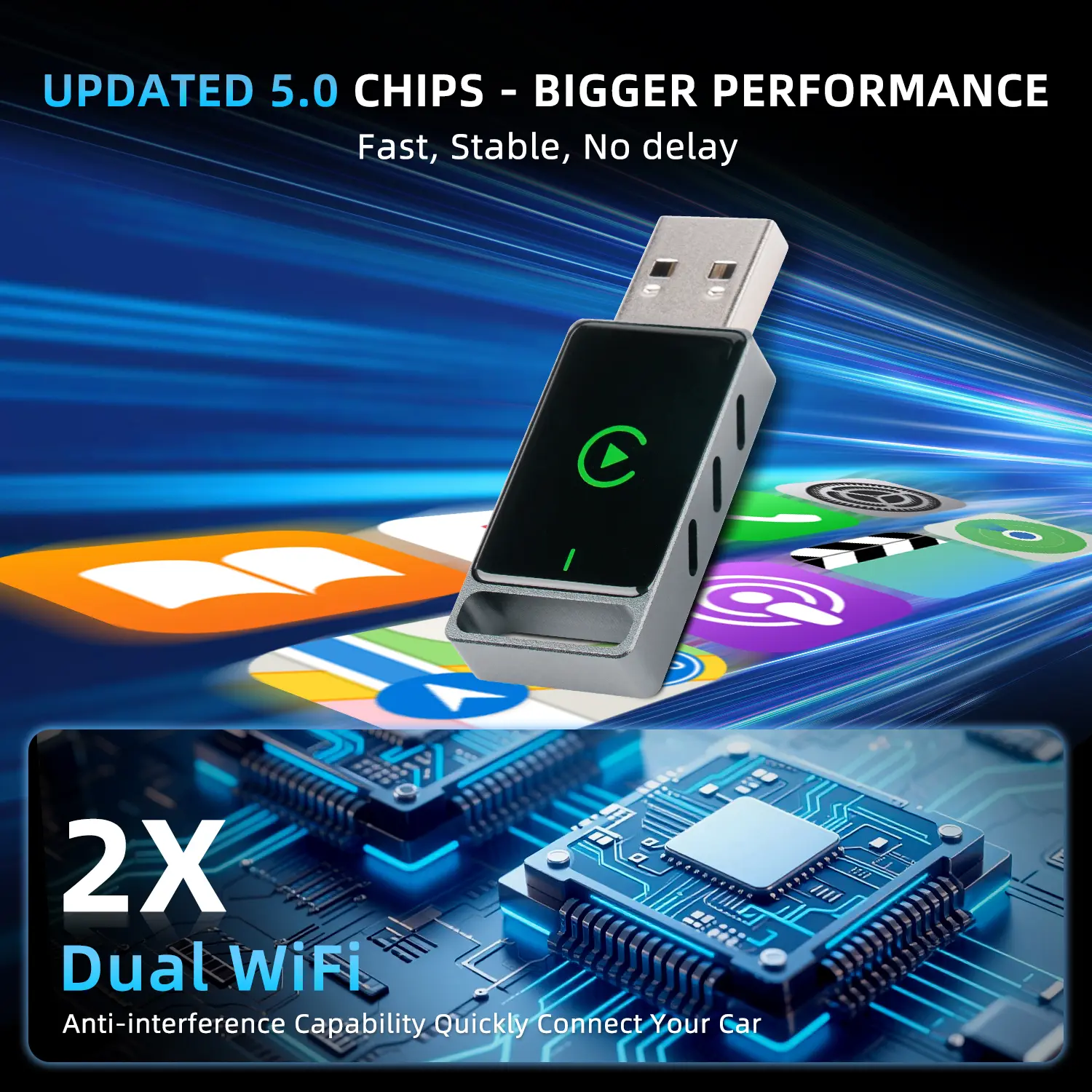 Advanced chips, fast and stable: The carplay wireless adapter adopts the new generation of Bluetooth 5.0 technology, providing you with powerful and stable signal transmission and low-power operation mode. Advanced Bluetooth and WIFI technologies make connections faster, more stable and delay-free, offering you a smooth and convenient user experience.