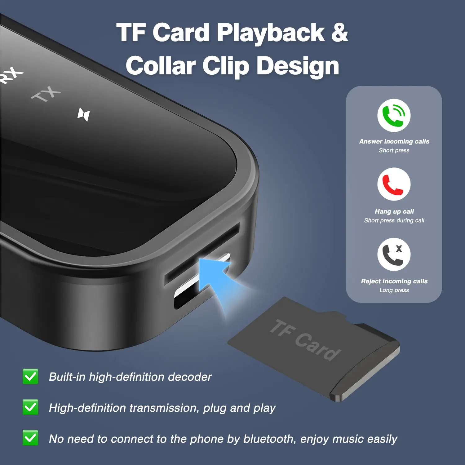 ·TF Card function: Supports TF card playback with a built-in high-definition decoder for clear calls in noisy environments. Features a collar clip design for easy attachment and one-click operation.