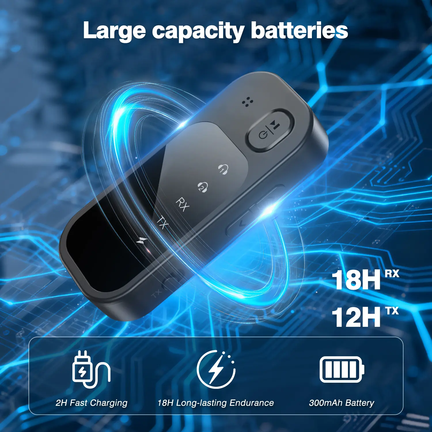 ·Extended playback time: Ultra-low power consumption technology and a high-capacity 300mAh battery provide up to 18 hours of continuous use in TX mode and up to 12 hours in RX mode. Full charge takes 2 hours through the Type-C port.