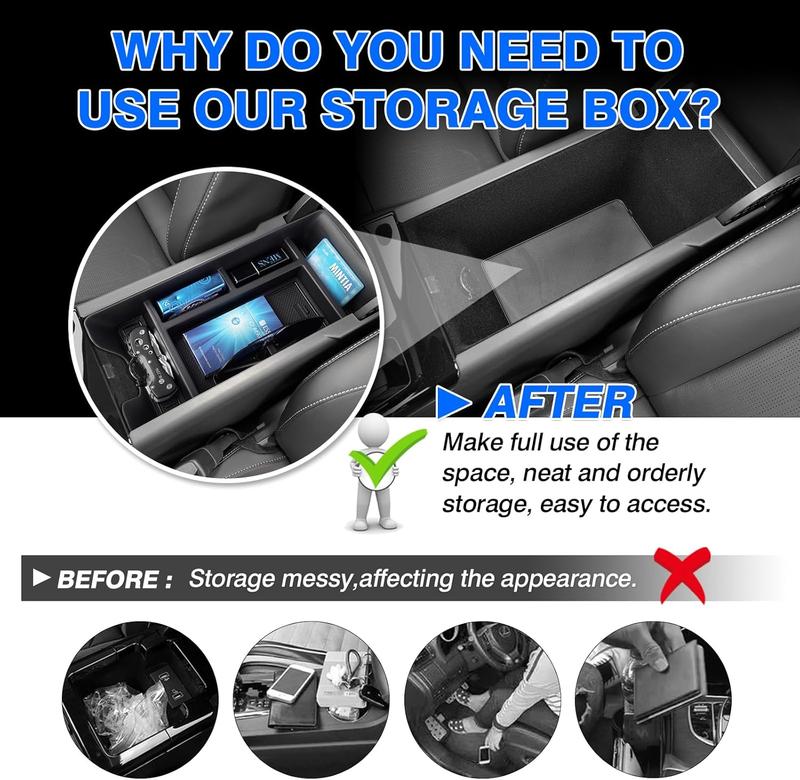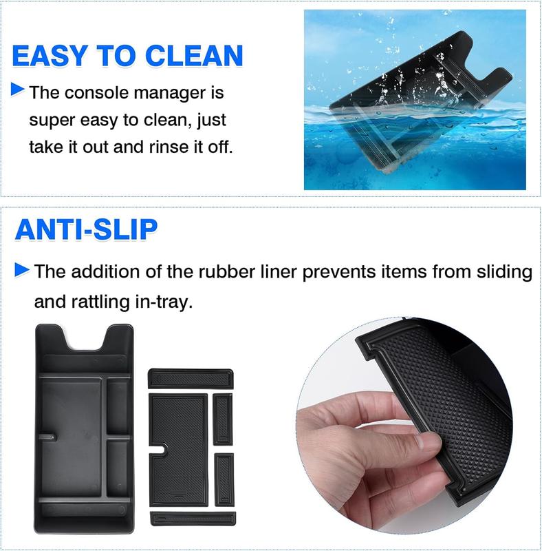 Well-made Organizer:It is made of a durable and sturdy ABS shell. The even edge and smooth surface give the armrest storage box an OEM part appearance. Additionally, the provided tasteless and non-toxic rubber liner effectively prevents items from sliding and rattling.
