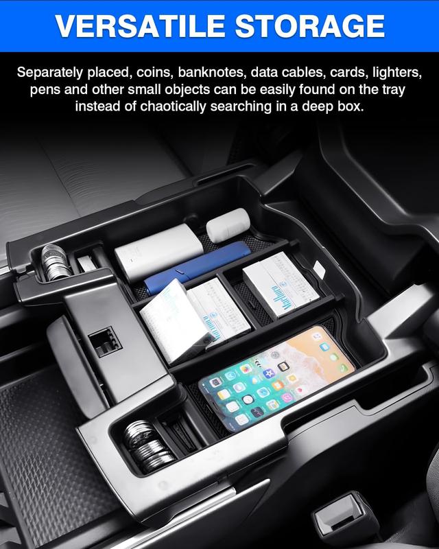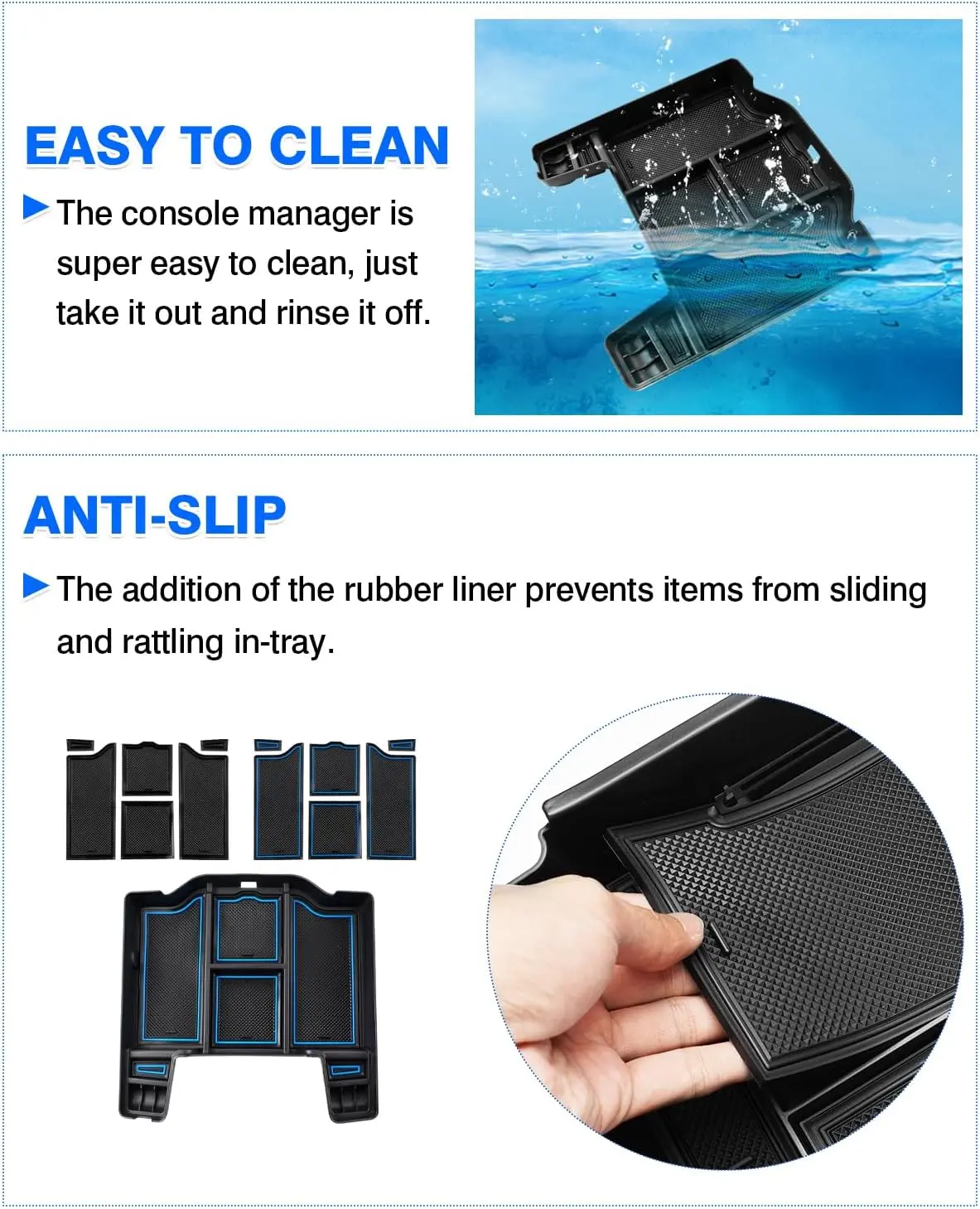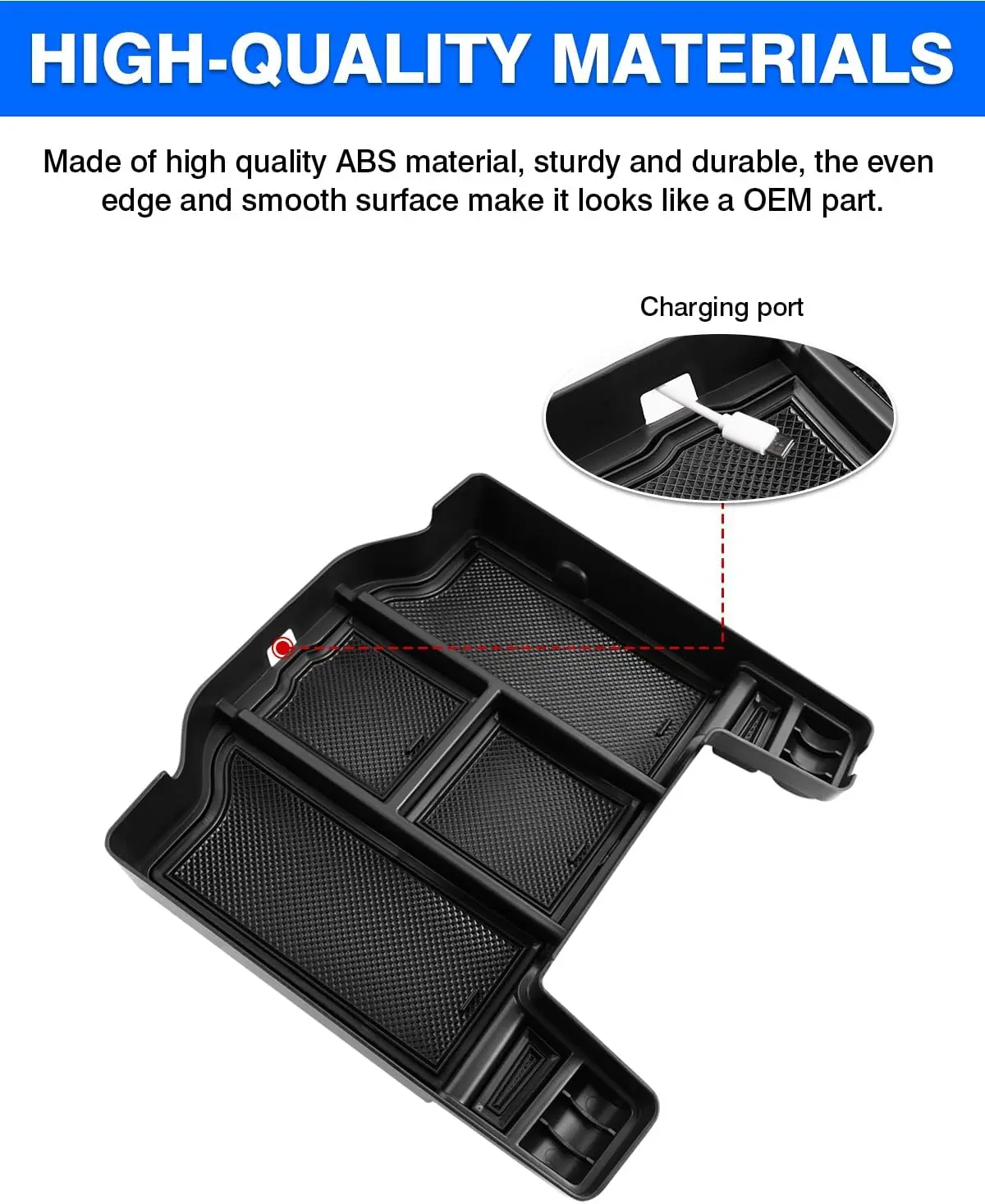 Well-made Organizer: It is made of a durable and sturdy ABS shell. The even edge and smooth surface give the armrest storage box an OEM part appearance. Additionally, the provided tasteless and non-toxic rubber liner effectively prevents items from sliding and rattling.