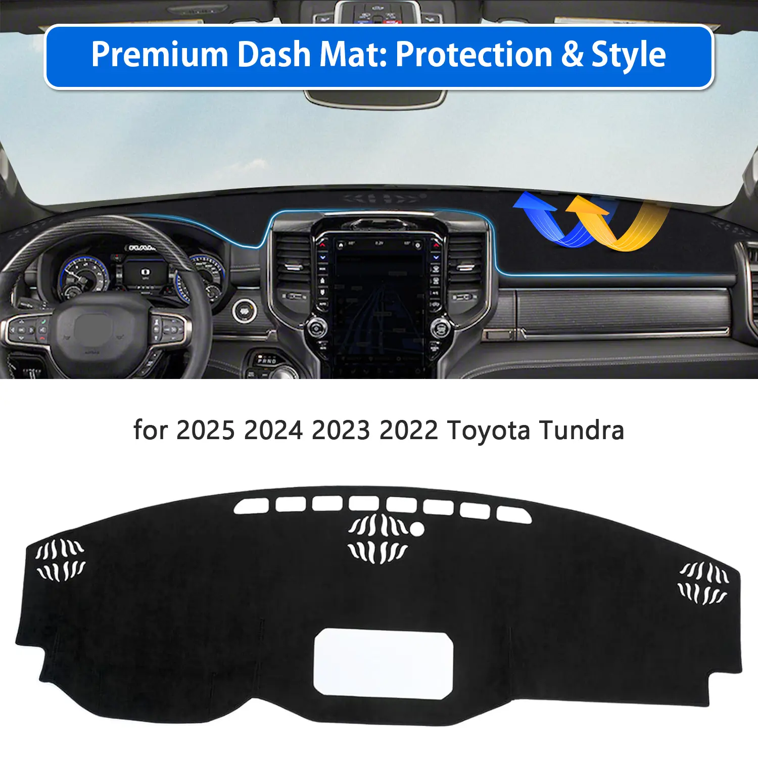 ·The Tundra Dash Cover is meticulously engineered for the 2022-2025 Toyota Tundra. It ensures a seamless fit, enhancing your vehicle's interior aesthetics. This cover is tailored to fit perfectly, providing a clean look.