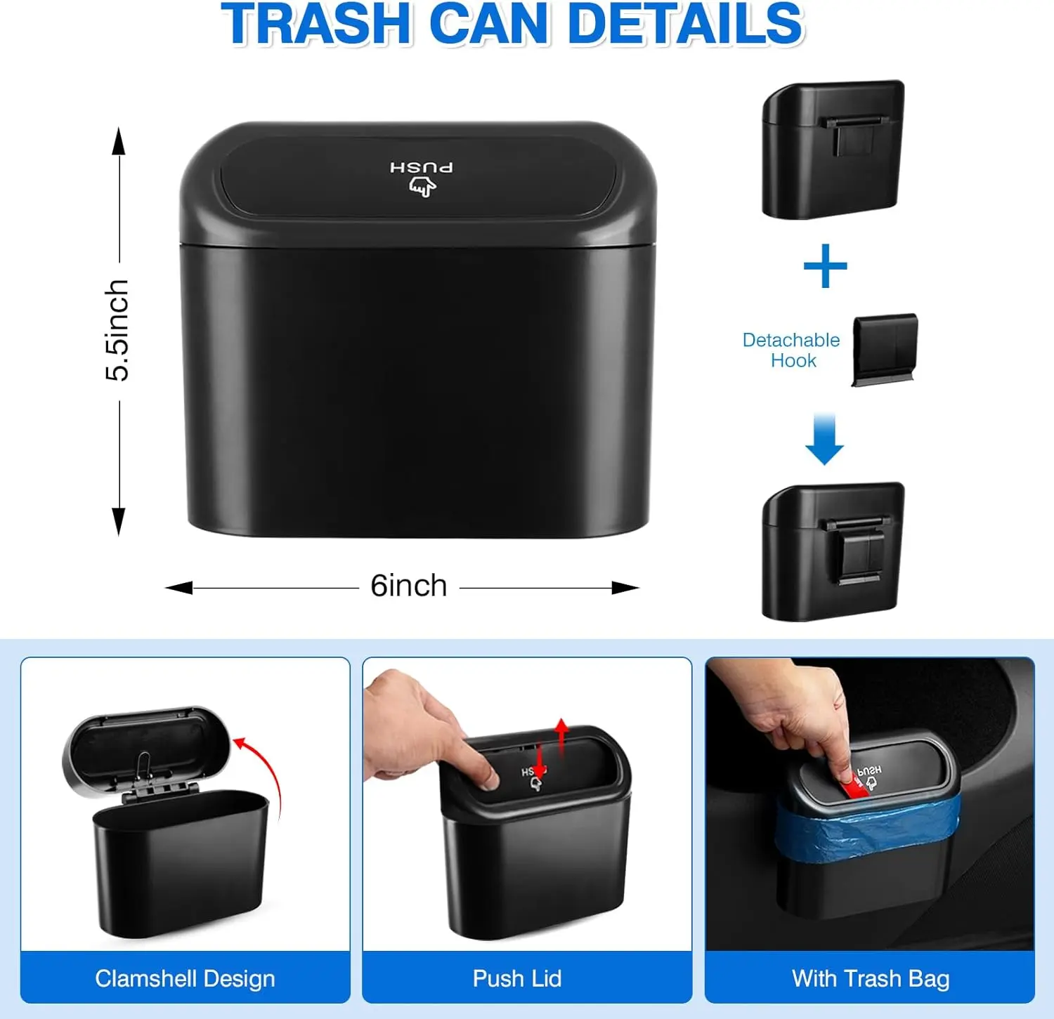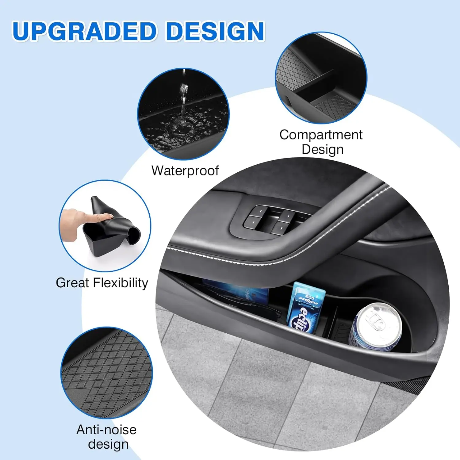 【Durable Material】Made of sturdy TPE material, our car front and rear door side tray organizer is scratch-resistant, waterproof and odourless, stable without displacement, durable without deformation. And mini trash can is made from quality ABS material. Effectively help to protect the car door storage area from scratches or damages.