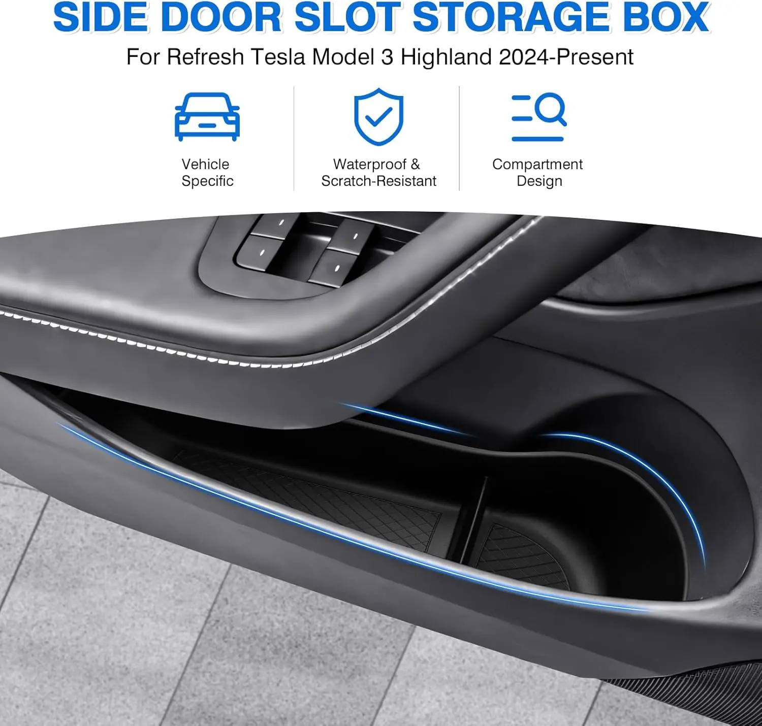 【Perfect Fit】Canvcle door side storage box and trash can are custom designed for Refresh Tesla Model 3 Highland 2024 2025. Looks like they came with the car, do not affect to open or close the door. Definitely an essential accessory for your Tesla!
