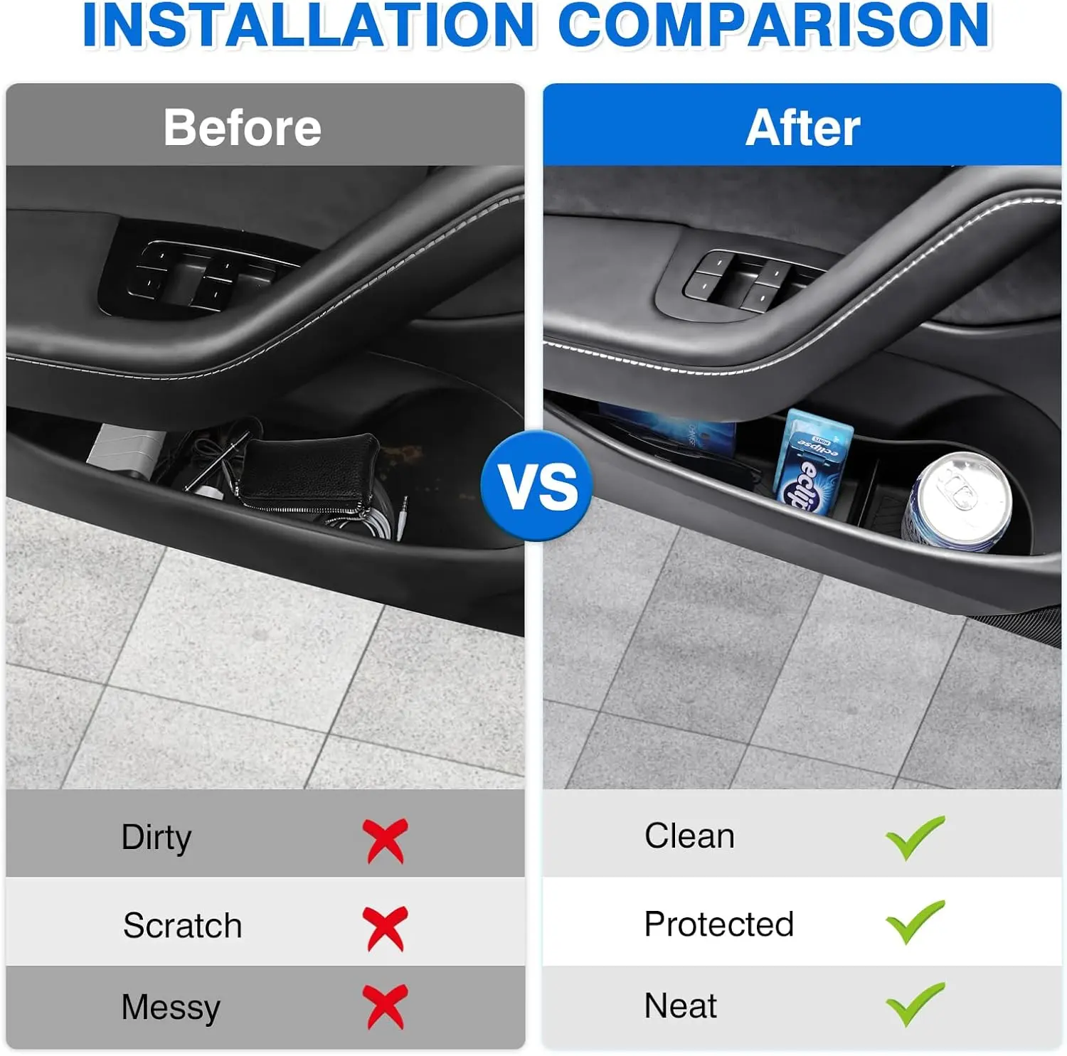 【Easy to Install & Remove】The door storage protector for Refresh Tesla Model 3 Highland is incredibly easy to install without any tools. Just simply slide it into the car door storage compartment, and it's ready to use. No damage to the original car. Easy to take out for cleaning with a towel.