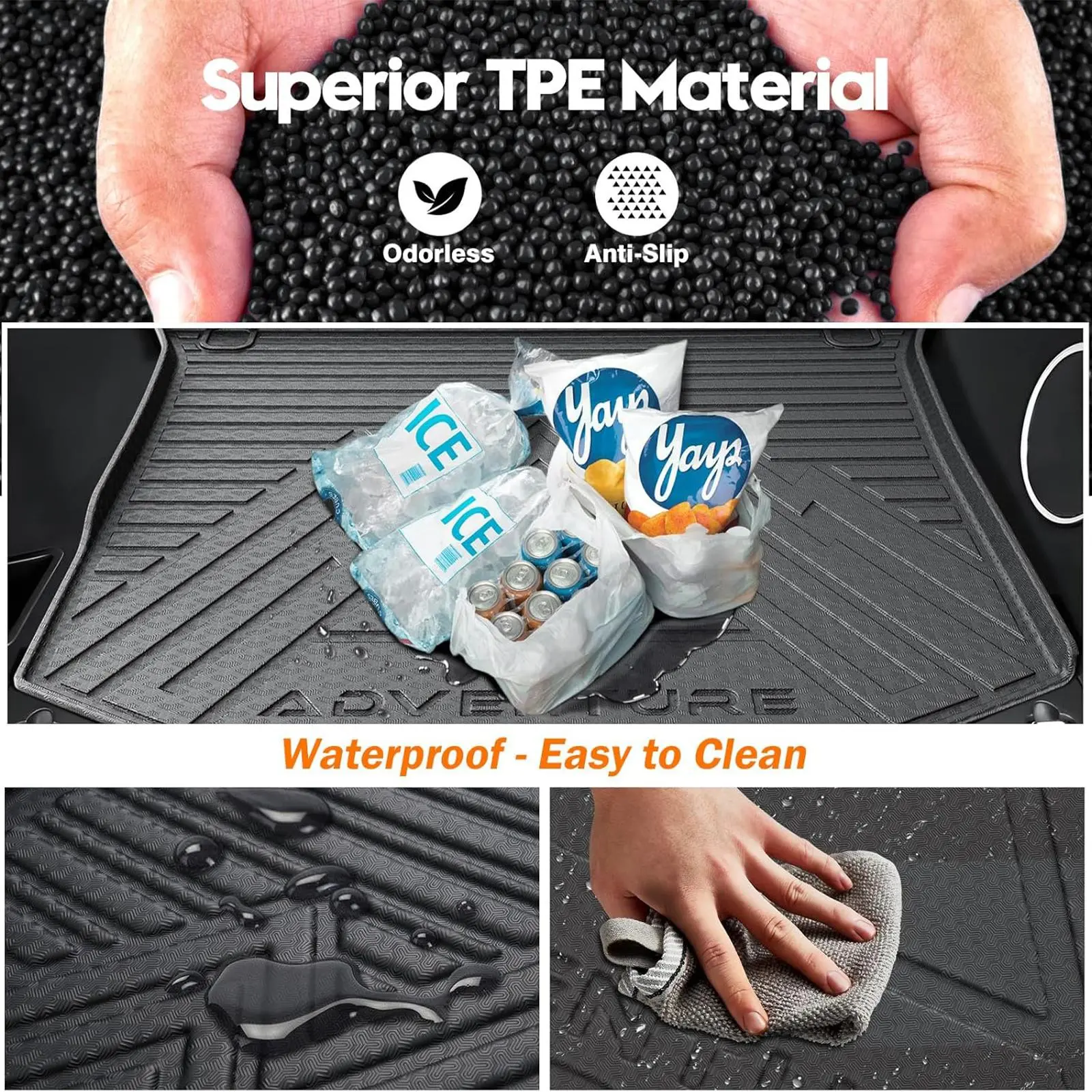 • 🏢 Made of TPE, these mats are odorless, free from plastic and chemical smells. They are sturdy, wear-resistant, and long-lasting, maintaining a clean interior. Dimensions: 37"L x 28"W x 5"T.