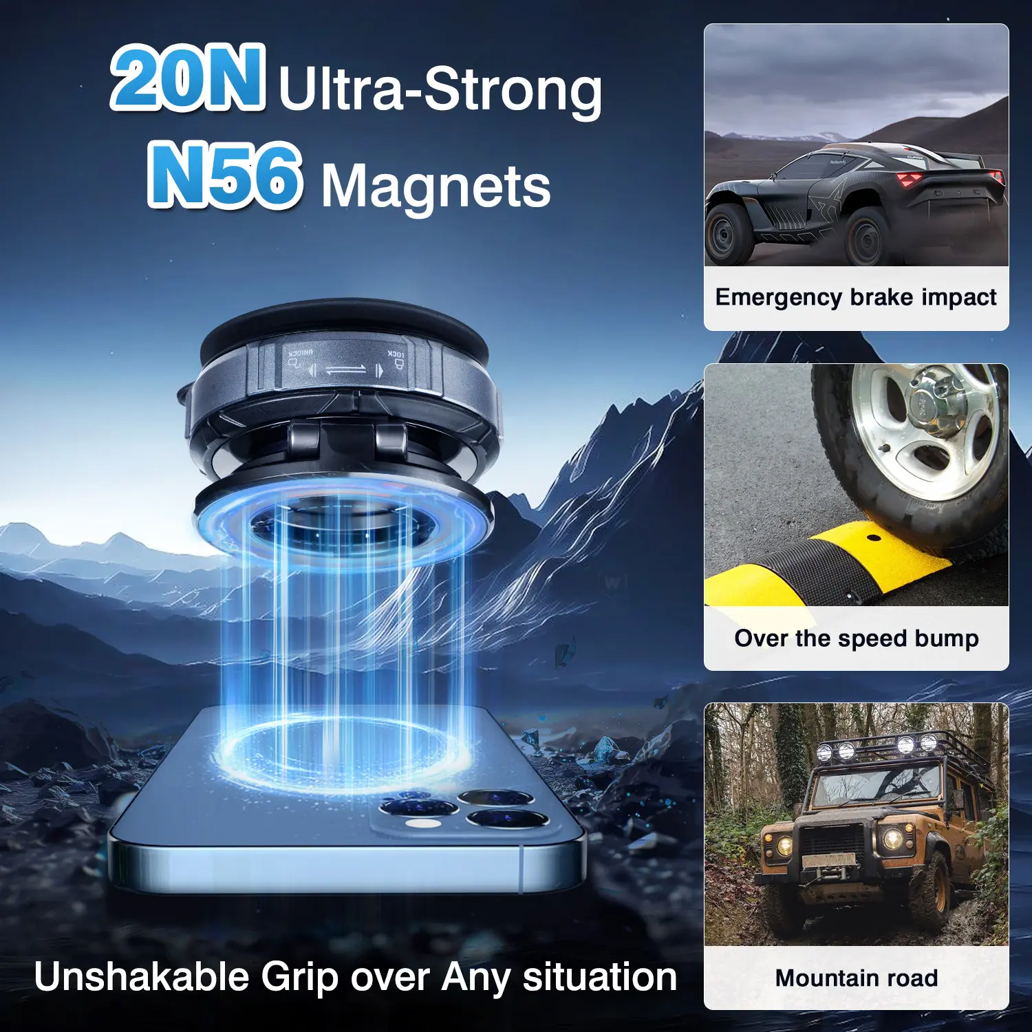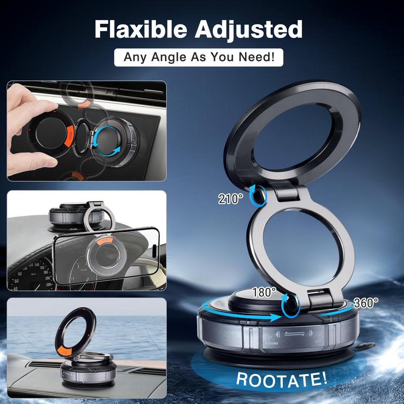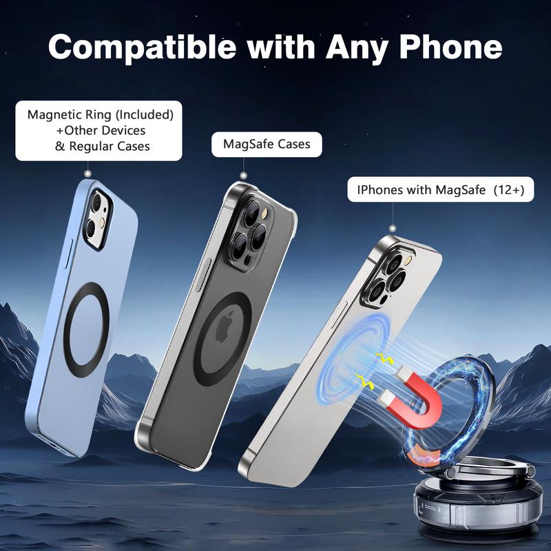 Upgraded with double-layer N56 neodymium magnets—strongest grade! Precise 1:1 ring alignment matches iPhone 16/15/14/13/12 series and MagSafe cases. Secures phones 3X tighter. Withstands emergency braking and off-road vibrations without wobbling. Closed-loop magnetic array maintains strength for 10+ years. Your phone stays secure, even with 4mm thick cases.
