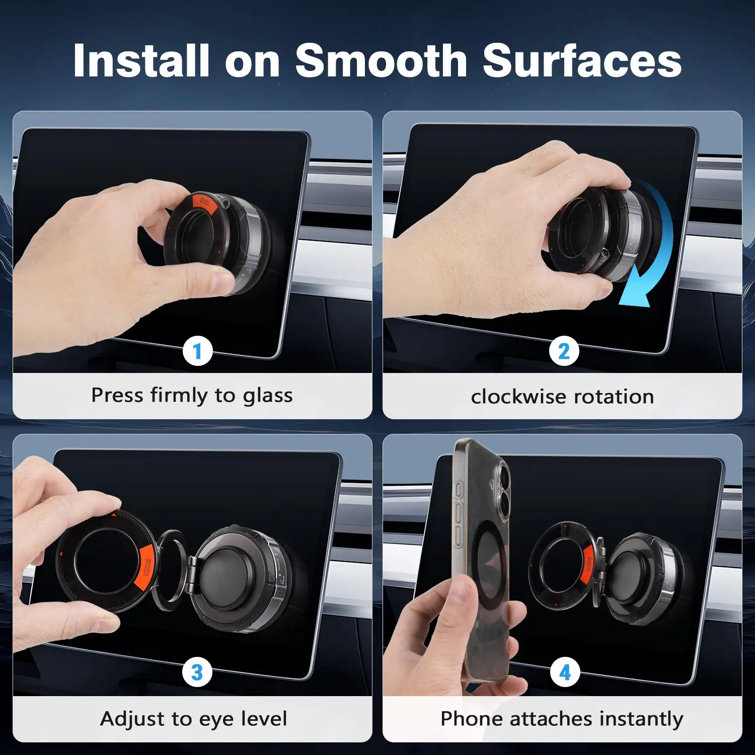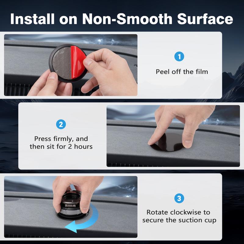 Vacuum suction base sticks to windshields, glass doors, ceramic tiles, acrylic surfaces, polished metal, stainless steel, aluminum, chrome, and smooth painted walls. Twist clockwise to attach, counterclockwise to remove without residue. Switch locations freely!