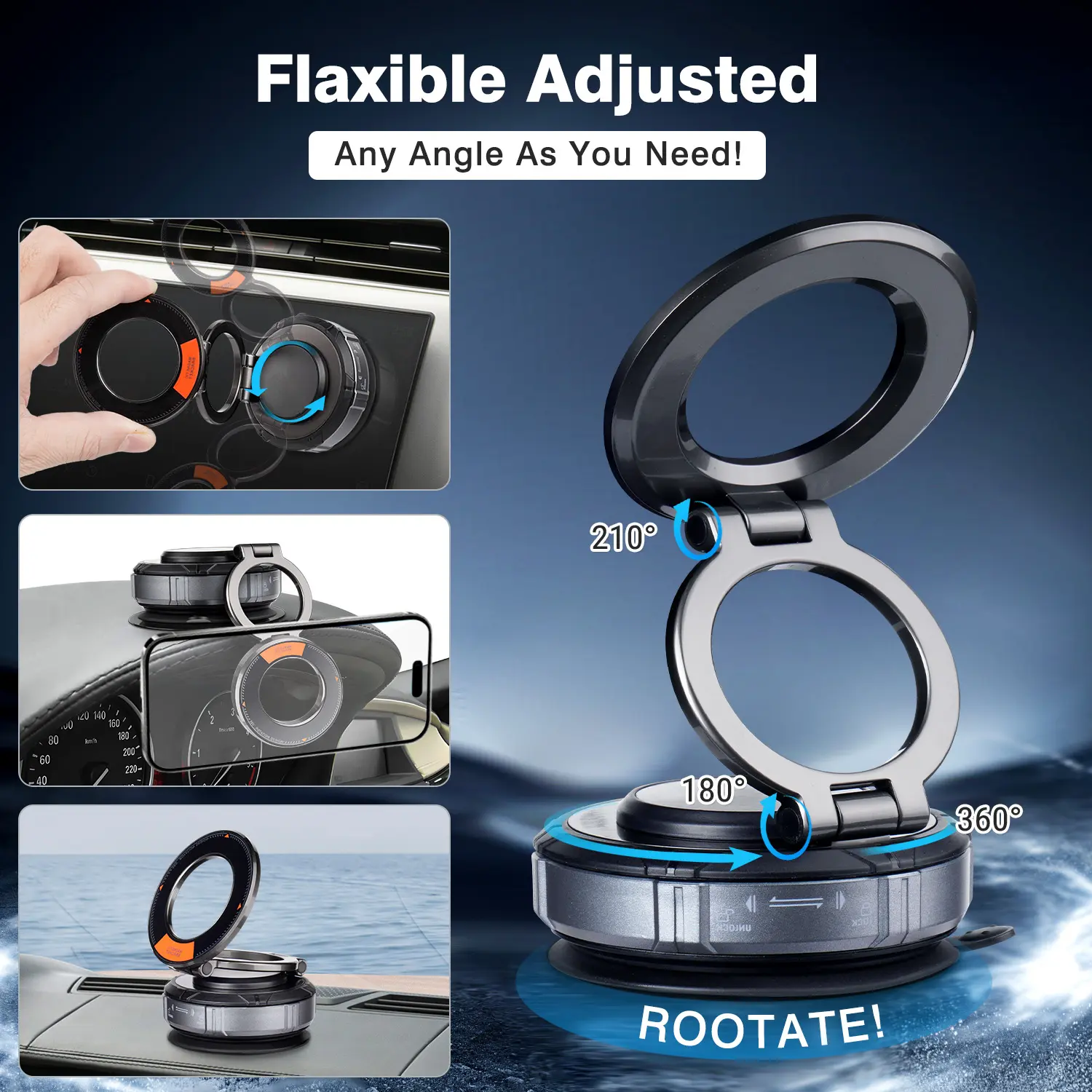 360° rotating base and 210°/180° dual-axis folding metal arms. Tilt vertically for GPS, flip horizontally for YouTube. Easy angle adjustments with one hand. Maintains position on bumpy roads.