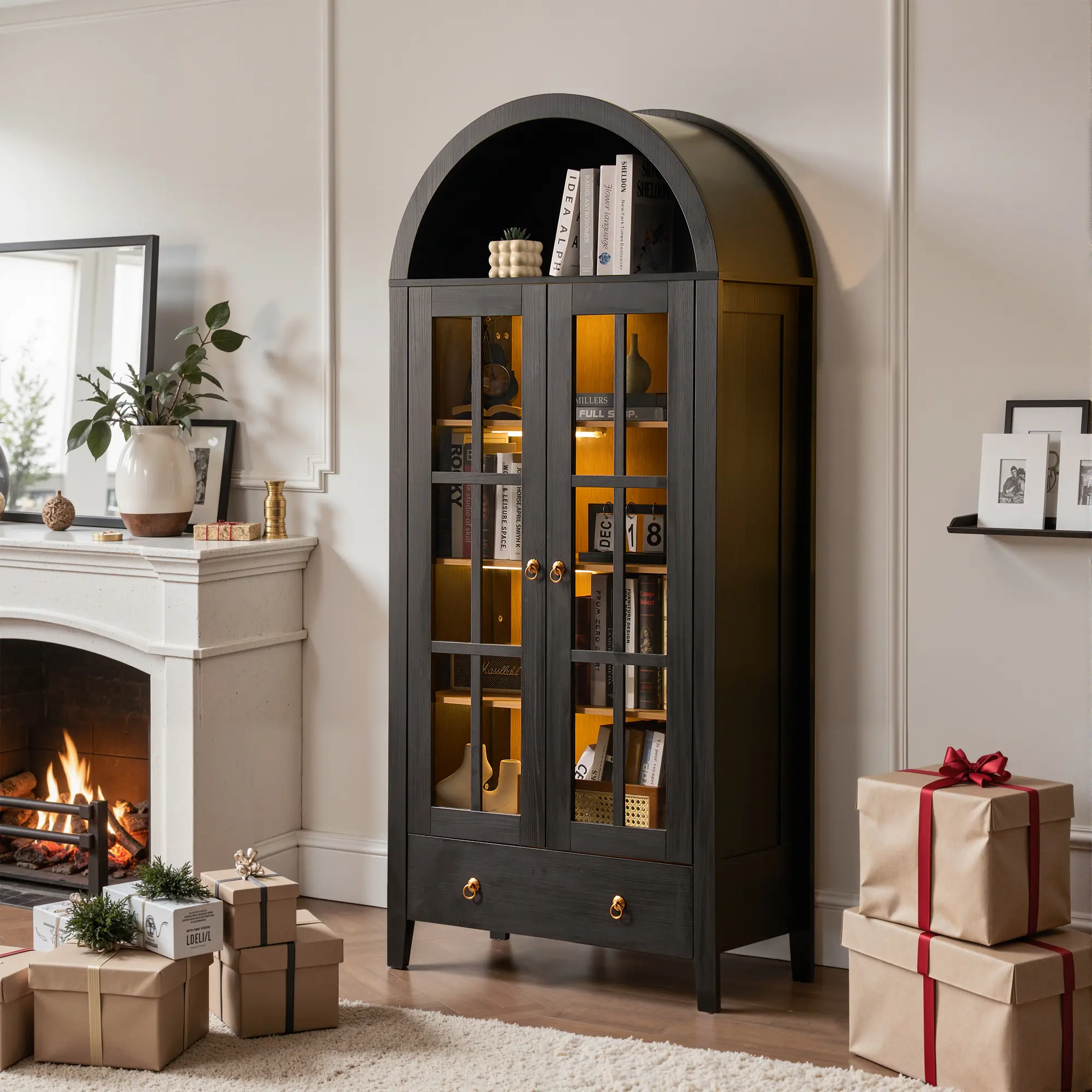 ✨ Elegant Design ✨ This Farmhouse Arched Cabinet features glass doors, offering a modern touch. Perfect for showcasing your items, it combines style with functionality. 📚