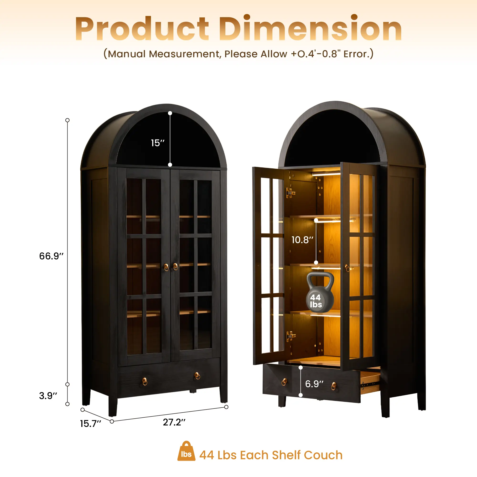CAODOC 2PCS 67" Display Cabinet with Glass Doors - Modern 5-Tier Arched Bookcase with Rechargeable 3-Color LED Lights & Motion Sensor, Large Pantry Cabinet for Kitchen, Living Room, Home Office