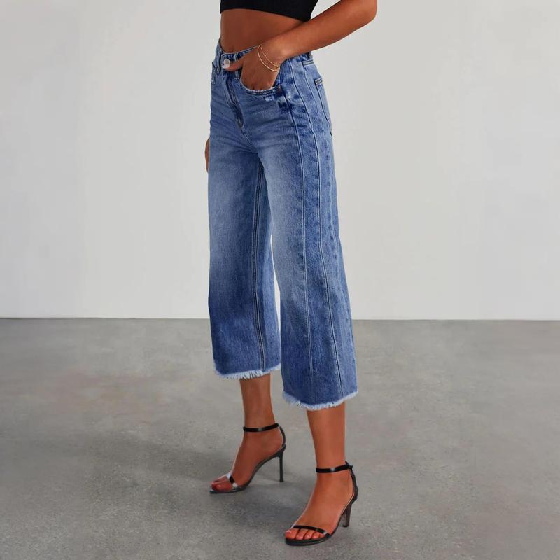 Features: Trendy jean features capris, high waisted, wide leg, raw hem, side seam, boyfriend, flare, zipper and five pockets design. The capri length allows for increased airflow and ventilation, helping you stay cool and comfortable all day long