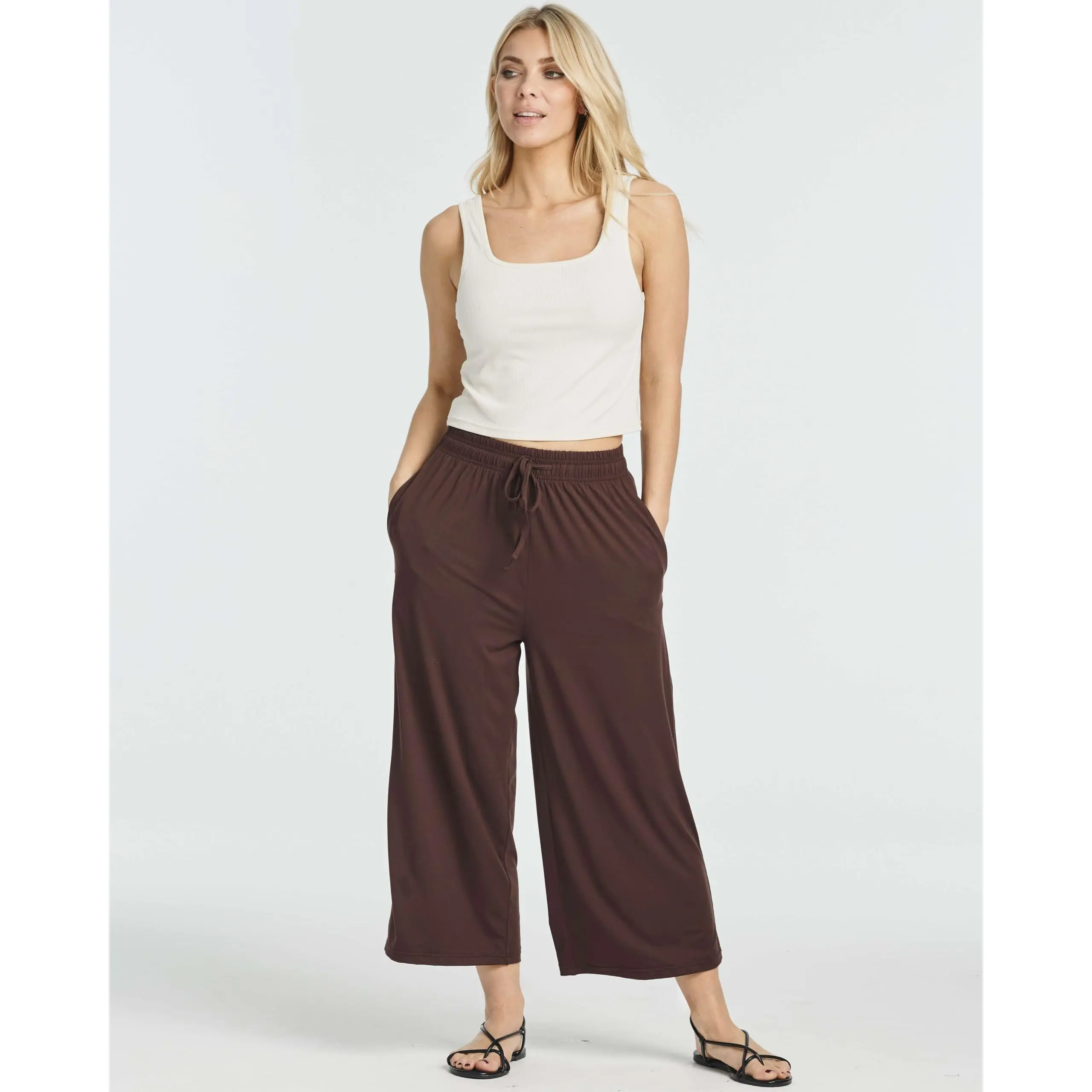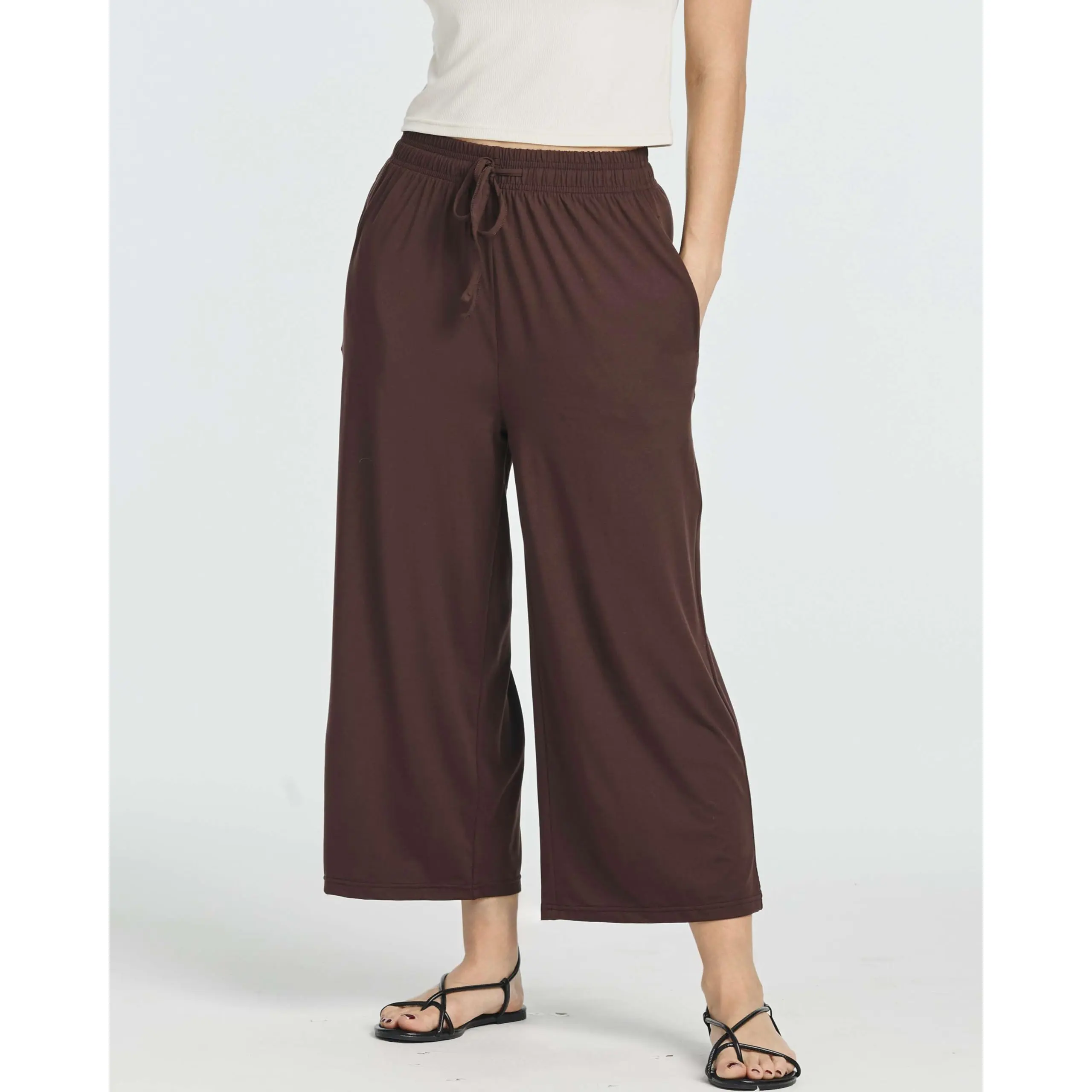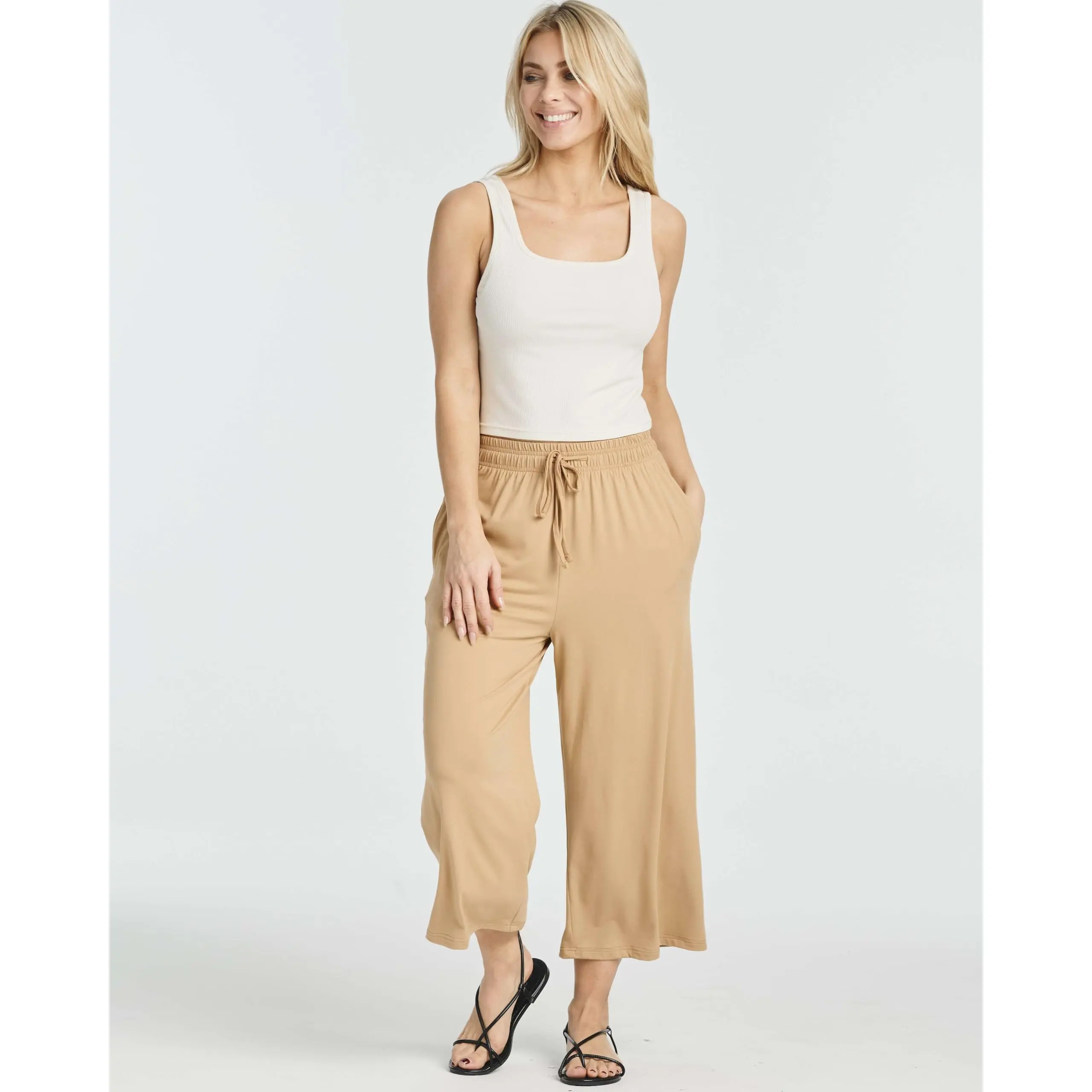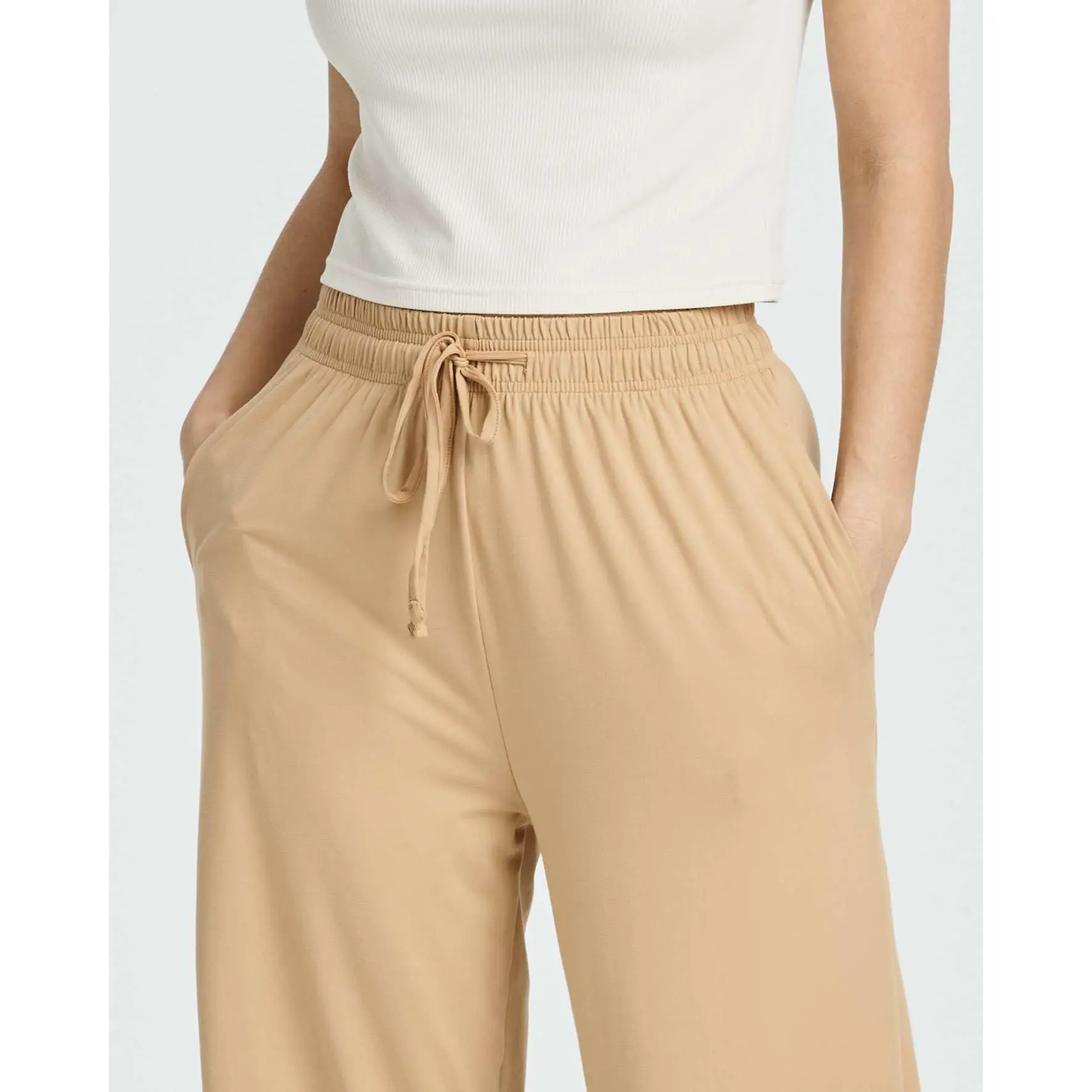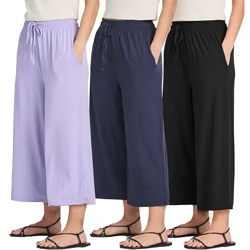 Capri’s r soft & very comfy w lightweight jersey material perfect for summer. Washed really well no wrinkles. Hav pockets. Elastic band at top is substantial. I sized down to small I’m right between med & small and they fit perfectly. Ordering another set! Not a solicited r paid review.