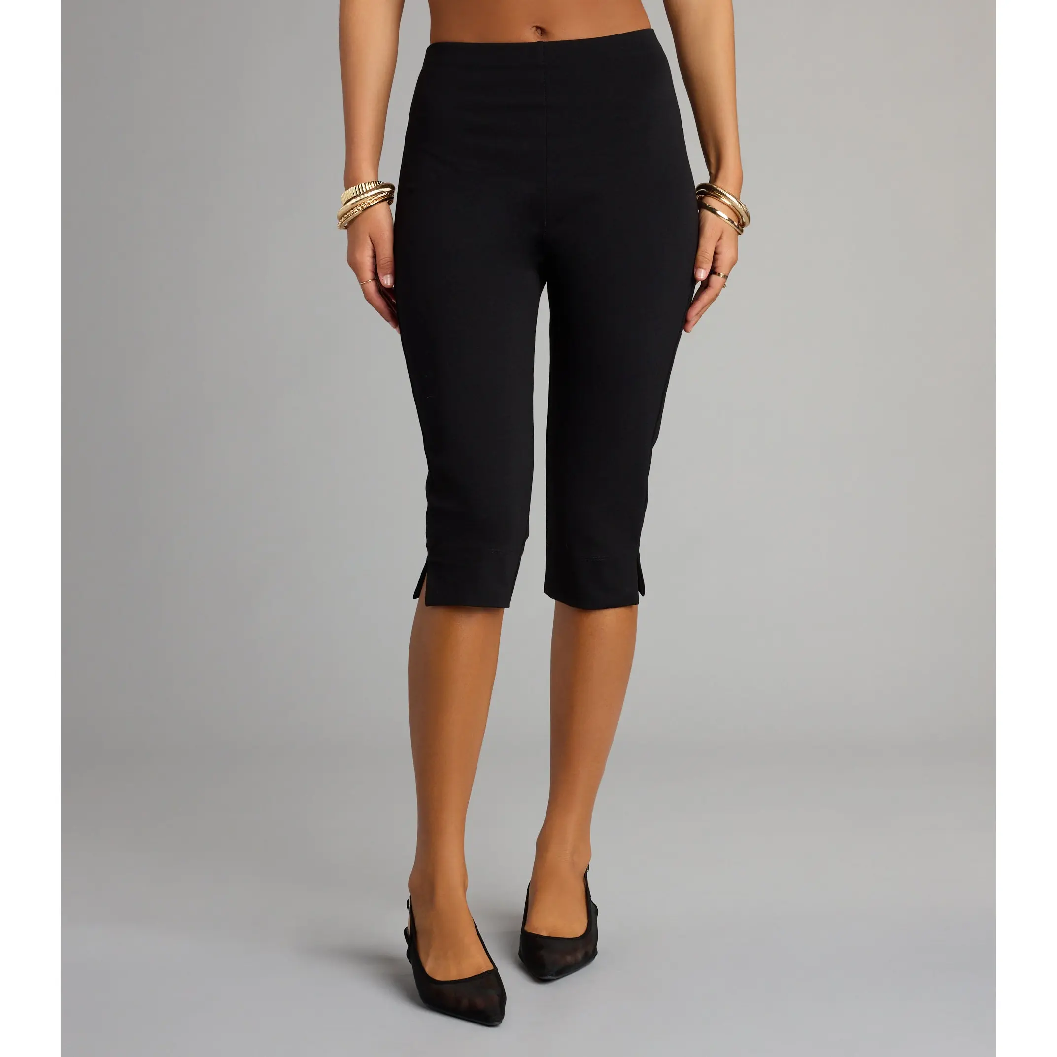 Slip into these classic and chic ponte capri pants for effortless style! Channel a 90s vibe in these pants featuring a flattering high-rise waist, form-hugging fit, and flirty side slit accents along the hem. Complete the look in a basic tee and sandals!