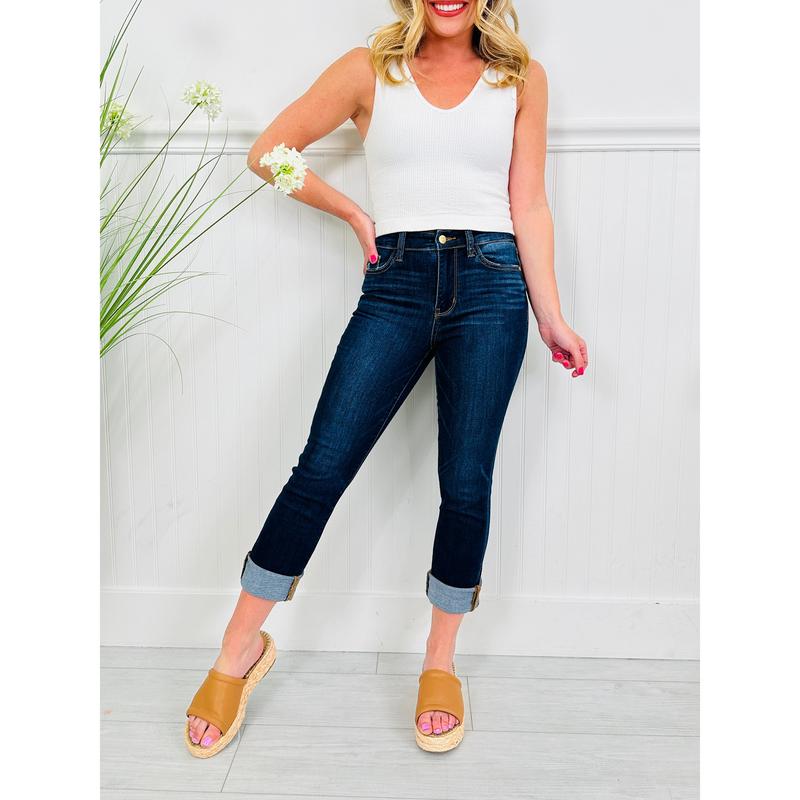 We love the dark and dreamy wash that's perfect for dressing up or down and wearing from work to weekend to everywhere in between. The adjustable cuff makes these capri jeans the perfect inseam for every woman of every height. The sun is coming-- add these best selling Judy Blue Capri jeans to your cart before they sell out (again)!