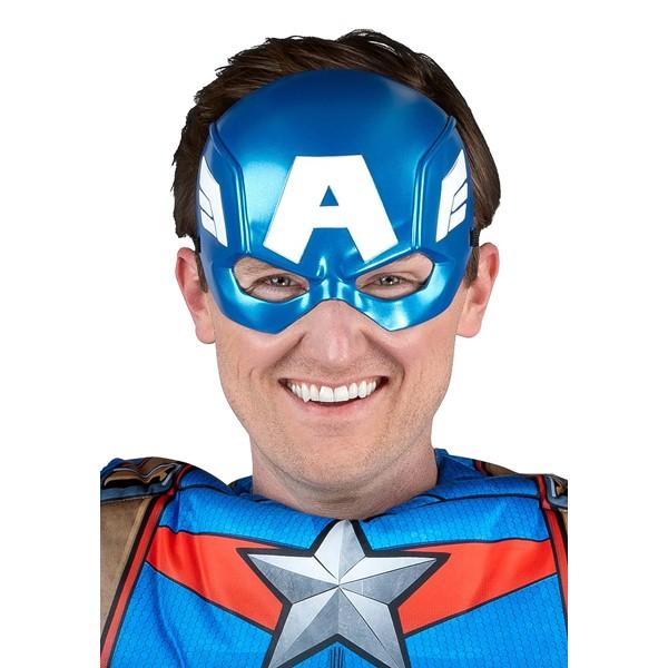· Molded plastic mask covers upper half of face, has elastic band around back of head