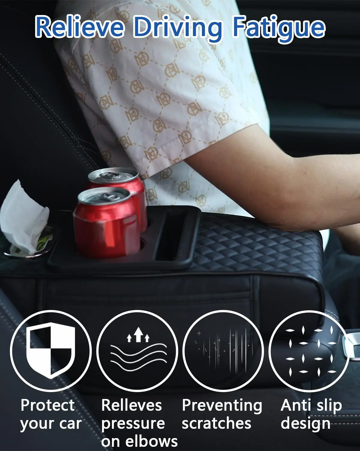 ·3.【RELIEVE DRIVING FATIGUE 】- The arm rest cover for car adopts ergonomic design, giving just the right amount of arm support, effectively dispersing elbow pressure and relieving driving fatigue. Protect your car's center console from getting dirty or scratched. Especially suitable for long time driving or long distance traveling, bringing you a new experience of relaxation and comfort!