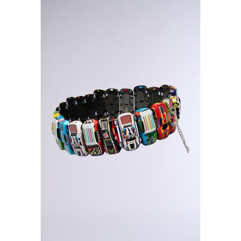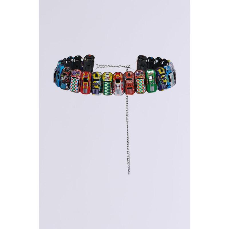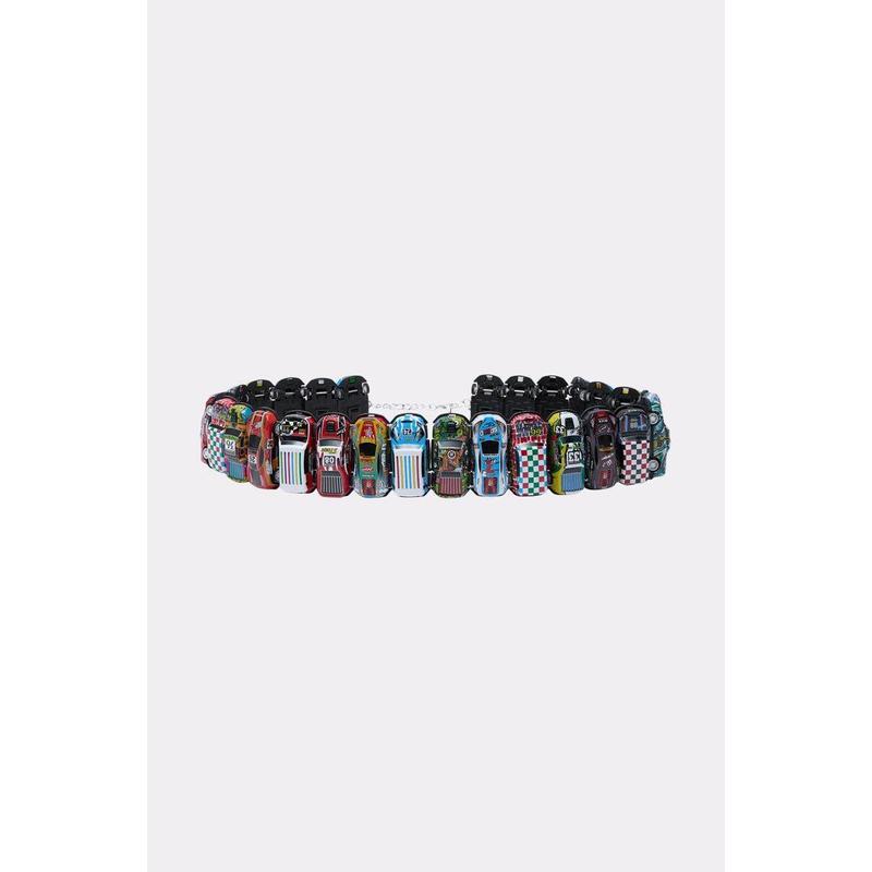 Accelerate into unique, elevated accessorizing with The AKIRA Label Fast Paced Car Belt. This nostalgic piece features a stretchy elasticized base, colorful assorted toy race car detailing, extended faux silver metallic chain link accents, and an adjustable lobster clasp closure. Style with a faux leather top, wide leg denim jeans, and chunky sneakers for a streetwear-inspired ensemble. - 100% Man-Made Materials(all measurements are approximate from size O/S)- 47” Length x 2.5” Width - ImportedProduct ID: 399333