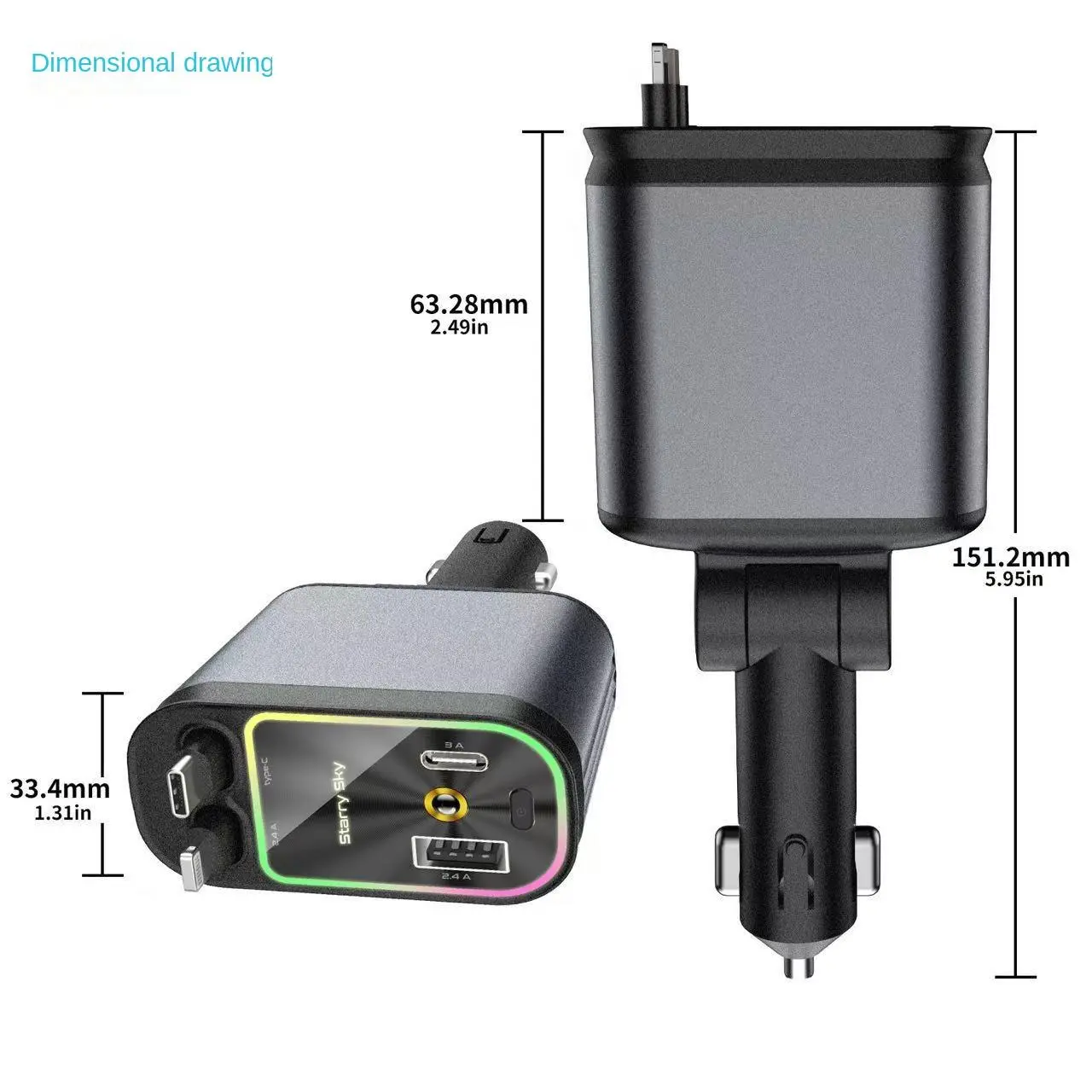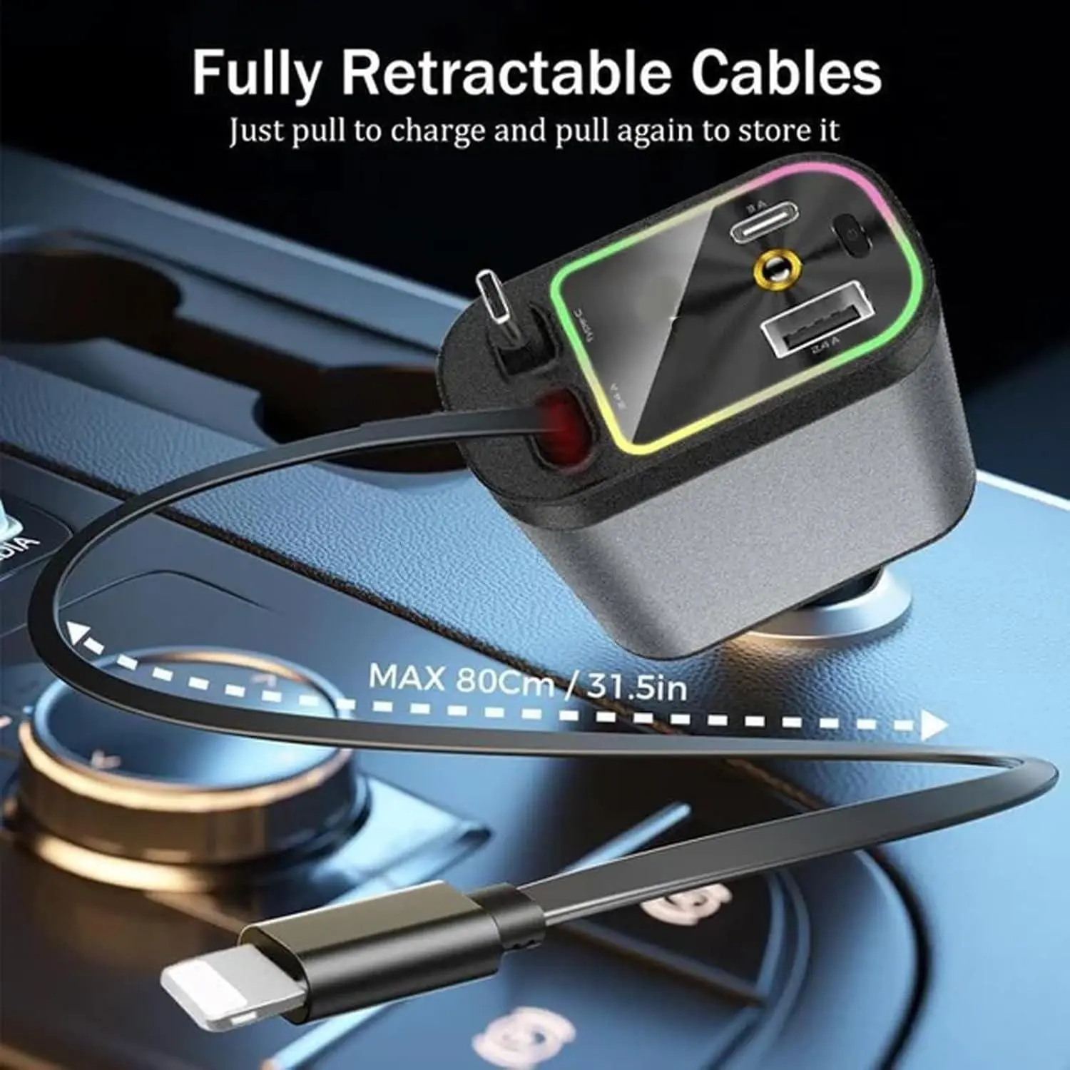 ·[ Upgraded Car Charger ]:Car Charger with Starry Sky. The 4 in 1 car charger equippes with a real PD 66W Type-C retractable cable (fast charging port), and IOS retractable cable, and additional USB-C and USB-A ports, this charger offers fast charging for up to four devices simultaneously.