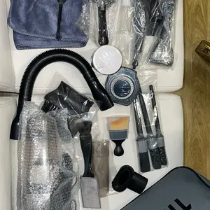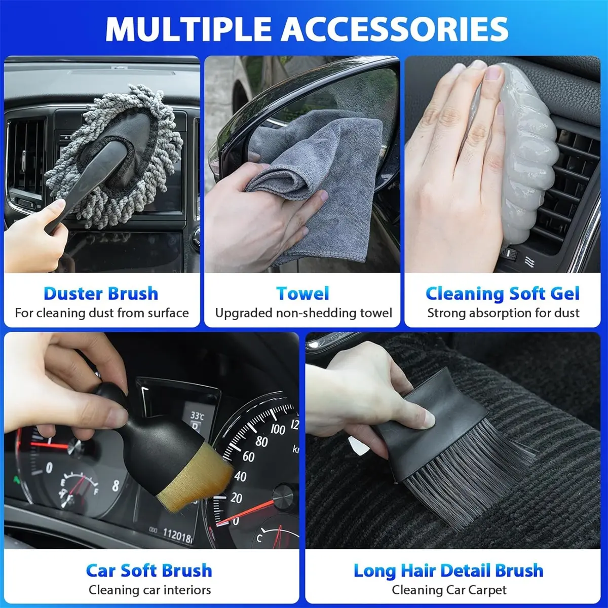 💼 21-Component Car Detailing Kit 📦- Vacuum Cleaner: Includes a high-powered vacuum cleaner with a filter brush, USB connector, extended hose, brush nozzle, long tube, and washable filters.- Accessories: 3 detail brushes, soft detail brush, long-bristle detail brush, microfiber towel, windshield brush, spray bottle, air vent brush, cleaning gel, dashboard dusting brush, and storage bag.