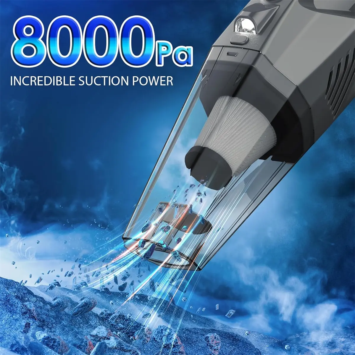 🌟 Powerful Suction Car Vacuum Cleaner 🌟- High-Powered Motor: Delivers up to 8000Pa of suction power for effective removal of dust, debris, pet hair, dirt, sand, and crumbs.- Efficient Cleaning: Ensures even the most stubborn particles are removed, leaving your car's interior spotless and fresh.