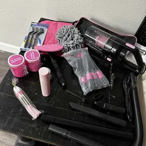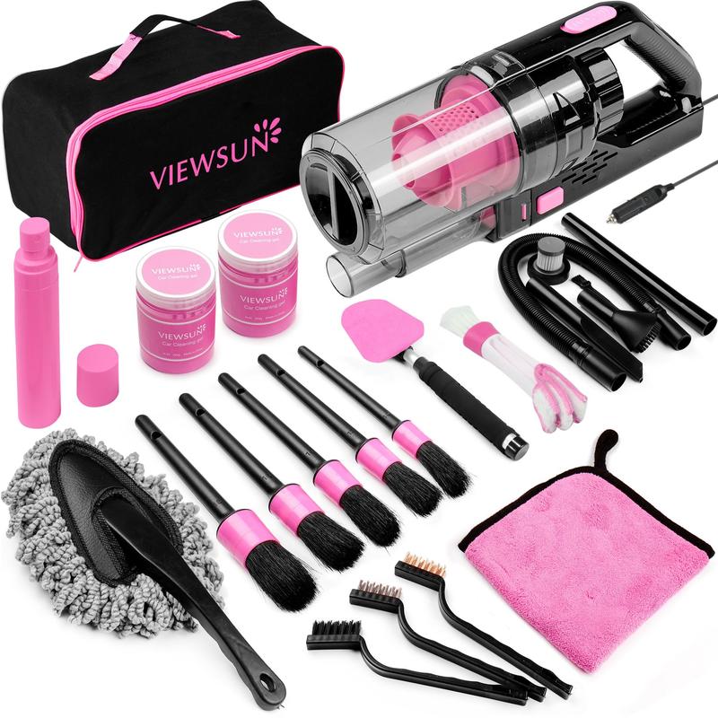 ·PINK CAR CLEANING KIT INCLUDES: 1 portable car vacuum, 2 car dust cleaning gel, 3 mini brush, 5 detailing brush, 1 car windshield cleaner,1 spray bottle, 1 coral fleece towel, 1 car dash duster brush, 1 air conditioner brush, 1 oxford storage bag. Perfect car cleaning kit interior to keep with you and have handy anytime you are ready to clean your car.