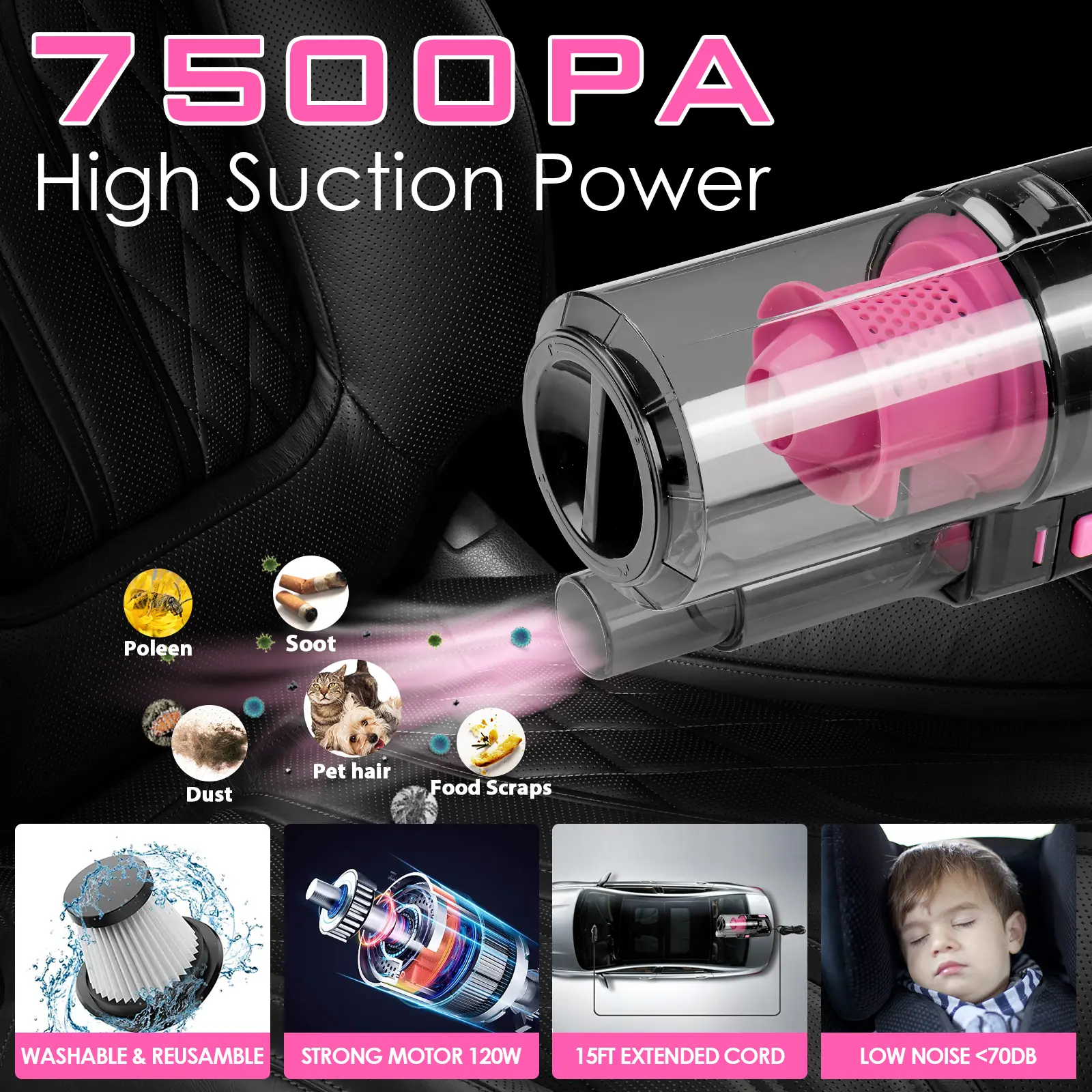 ·Powerful Suction & Multi-Angle Cleaning: With almost 7500Pa ultra-strong suction, the mini car vacuum can easily remove dust, sand, paper debris, pet hair or food scraps. Vacuum cleaner power cord is 15 feet long and comes with 4 accessories - slot pipette, long tube, brush nozzle, extension hose, which make cleaning car of every slot easy and time-saving.