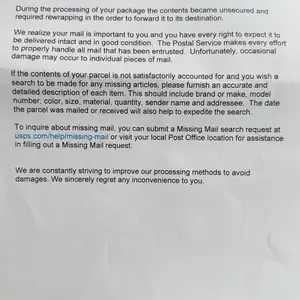 Missing more than half the ordered. Since package damaged yet again. Post office submitted only 4 items. Letter from post office on your bad dhipping