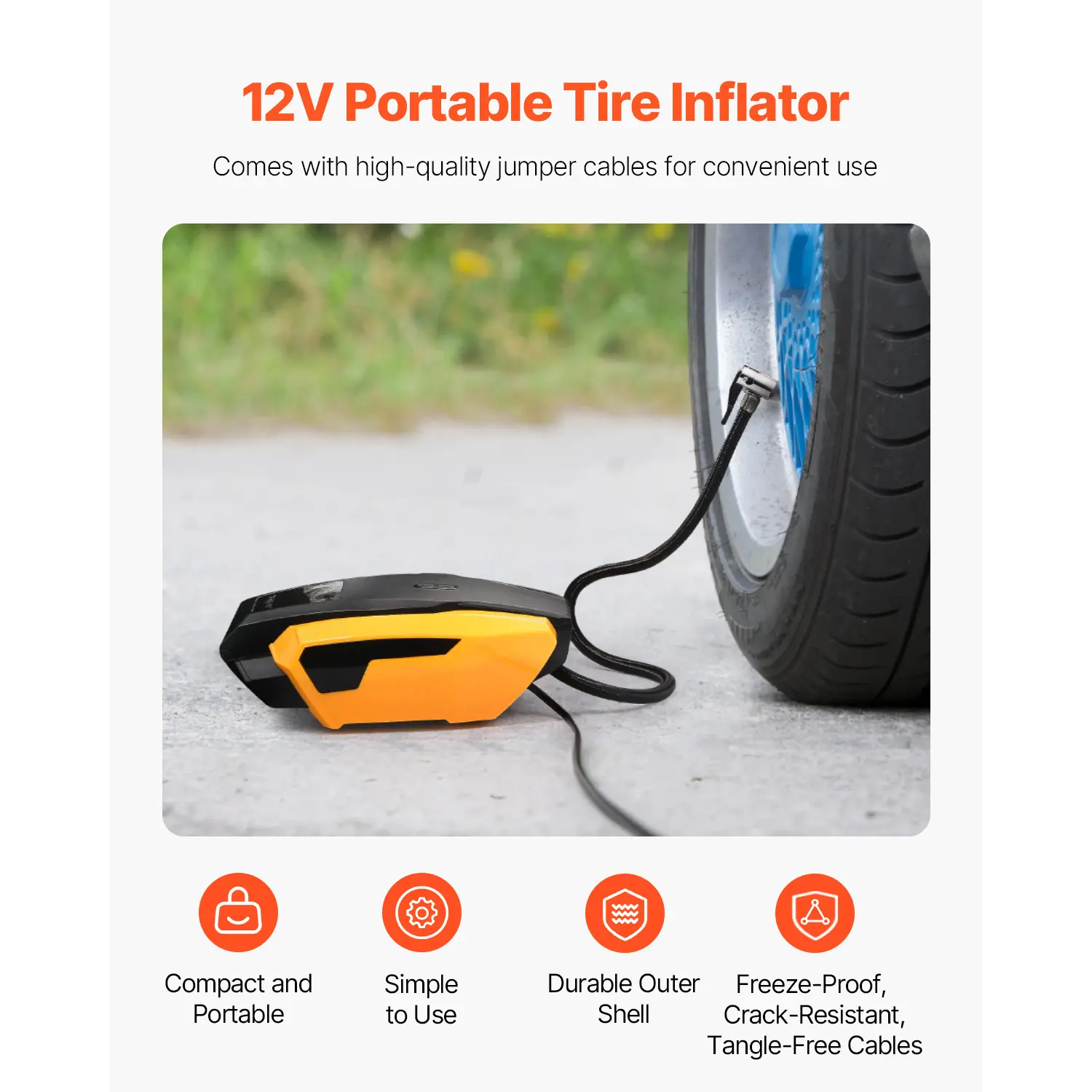 ·Features a 12V portable air compressor—compact yet powerful. Plug into your car’s cigarette lighter to inflate tires in seconds. Includes 12 ft / 3.6 m red and black jumper cables for quick jump-starts.