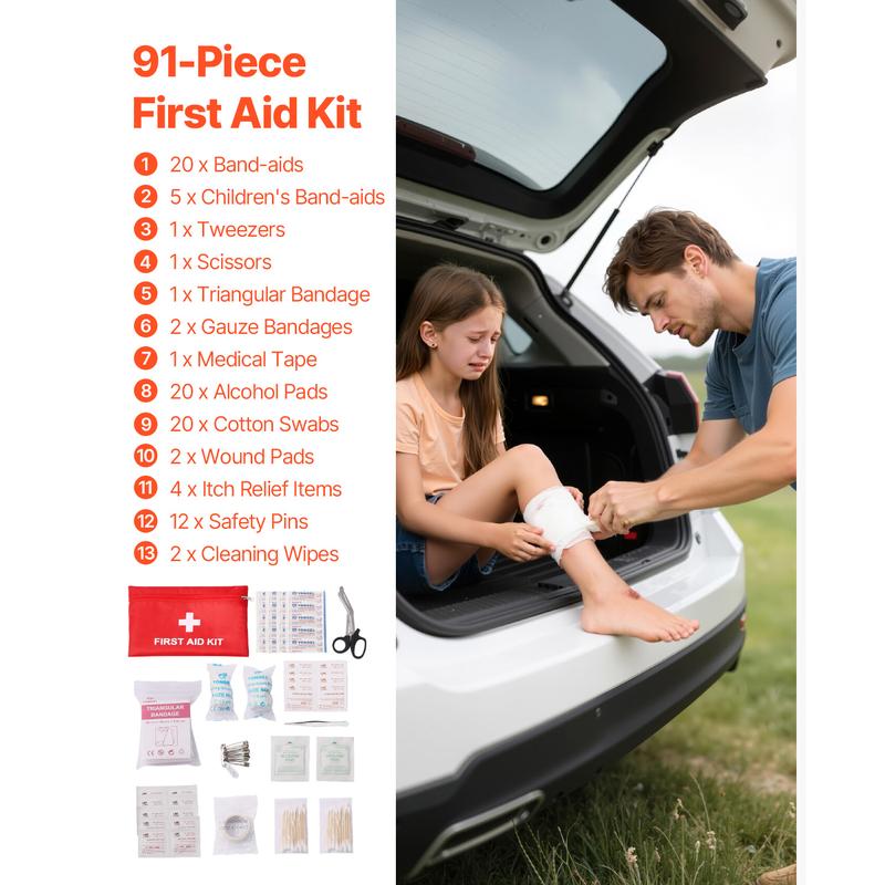 ·This roadside emergency kit includes daily medical essentials for all ages: bandages, tweezers, scissors, triangular bandage, gauze rolls, medical tape, alcohol pads, cotton swabs, wound pads, anti-itch tablets, pins, and antiseptic wipes.