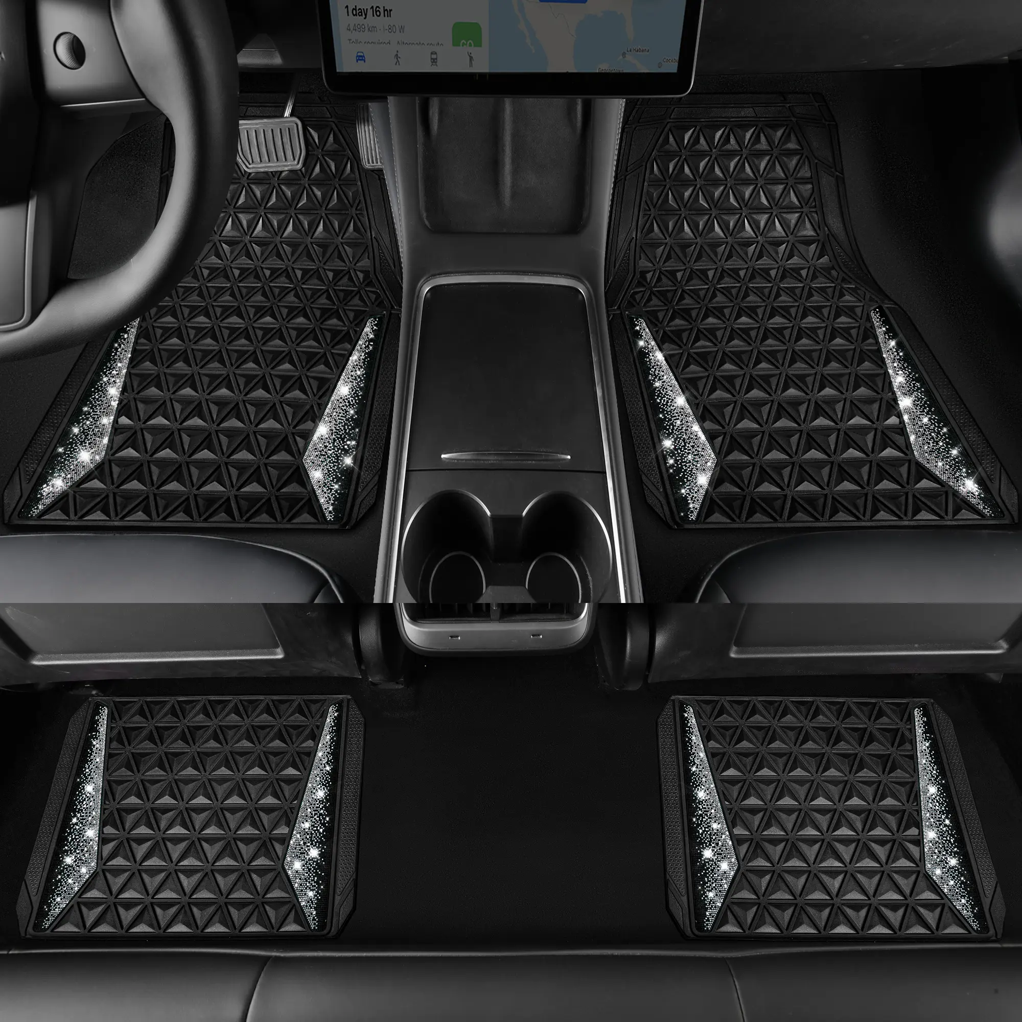 Made of high quality rubber, side on the rubber car mats has shining rhinestone, 4 pcs full set. The CAR PASS diamond rubber car floor mats use for all season. Protect your truck's floors from dirt and debris. Easy to clean. Made of high quality sparkly diamond.