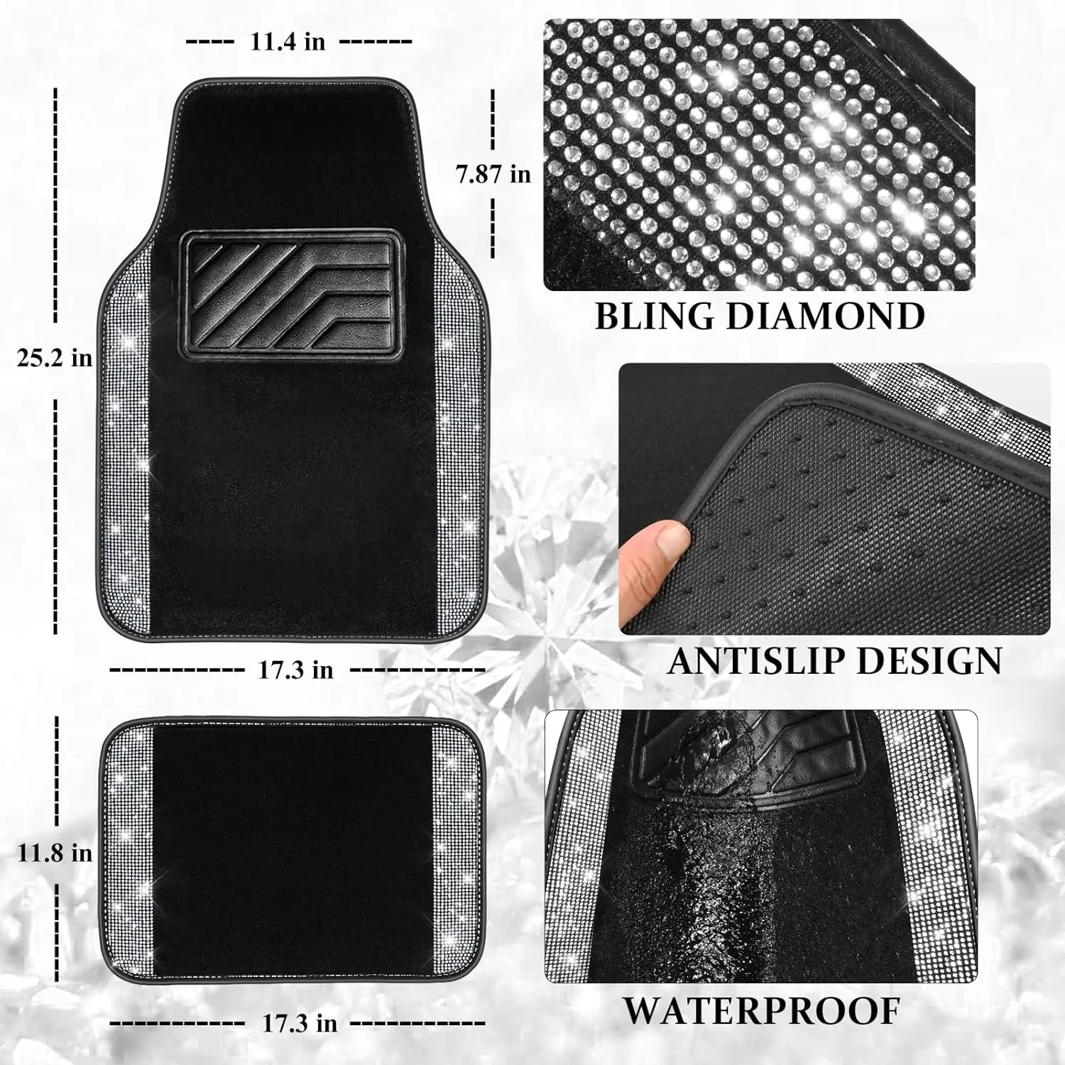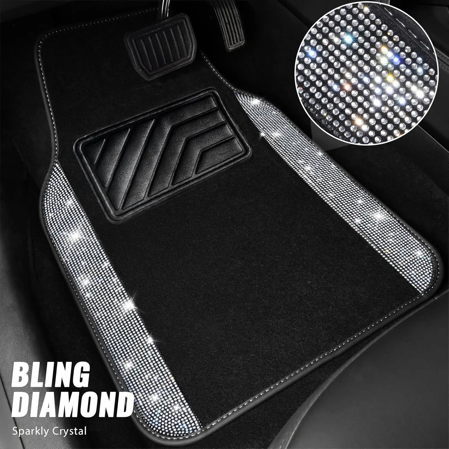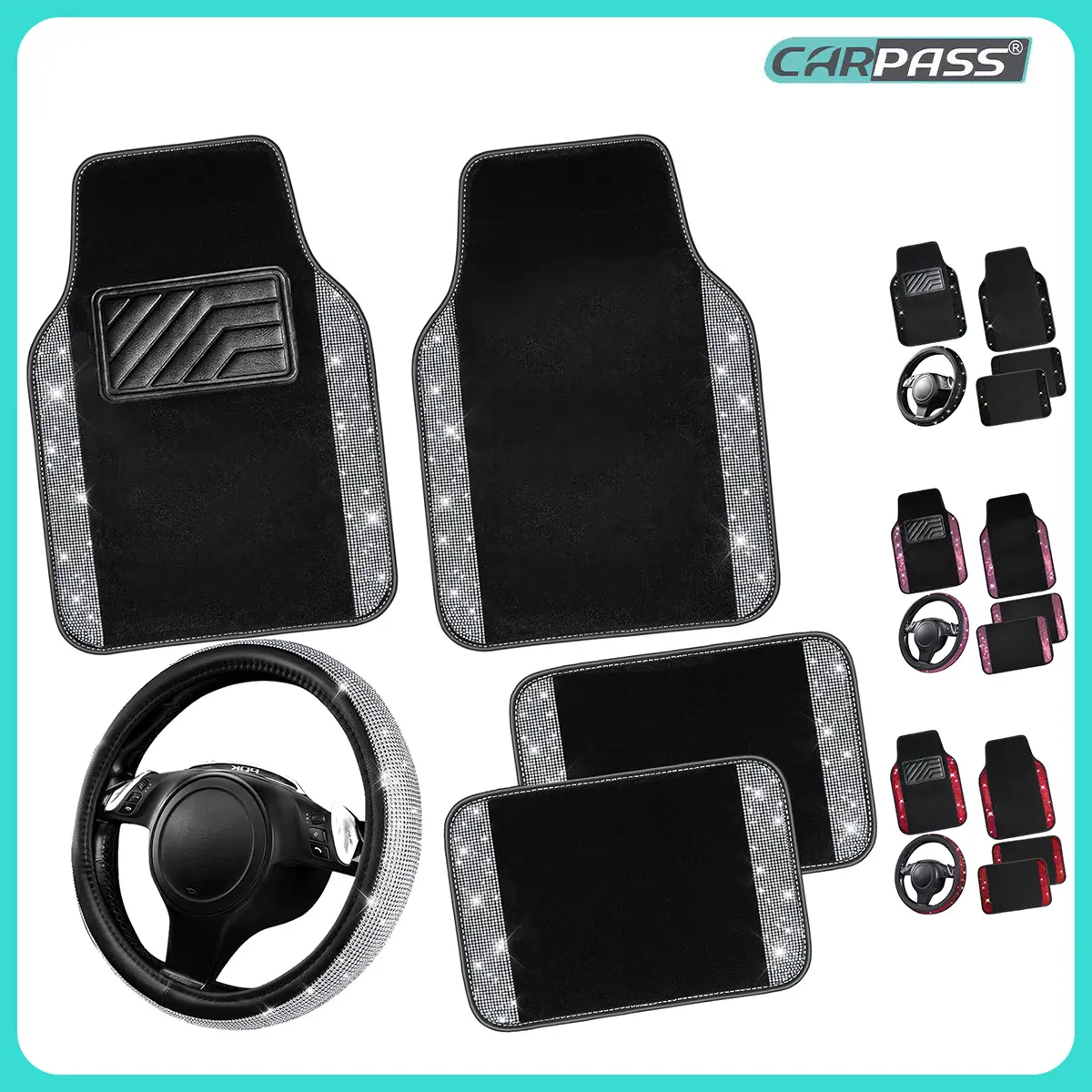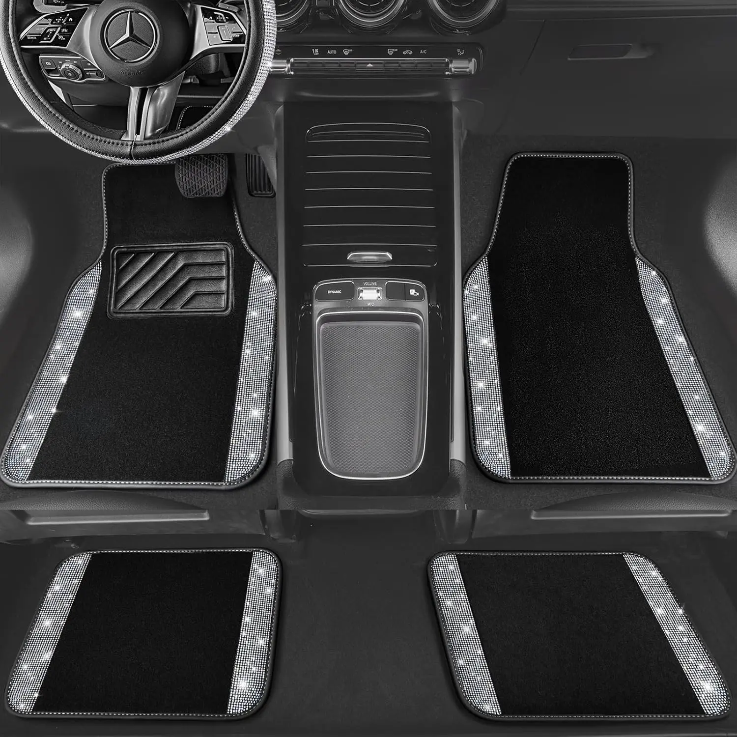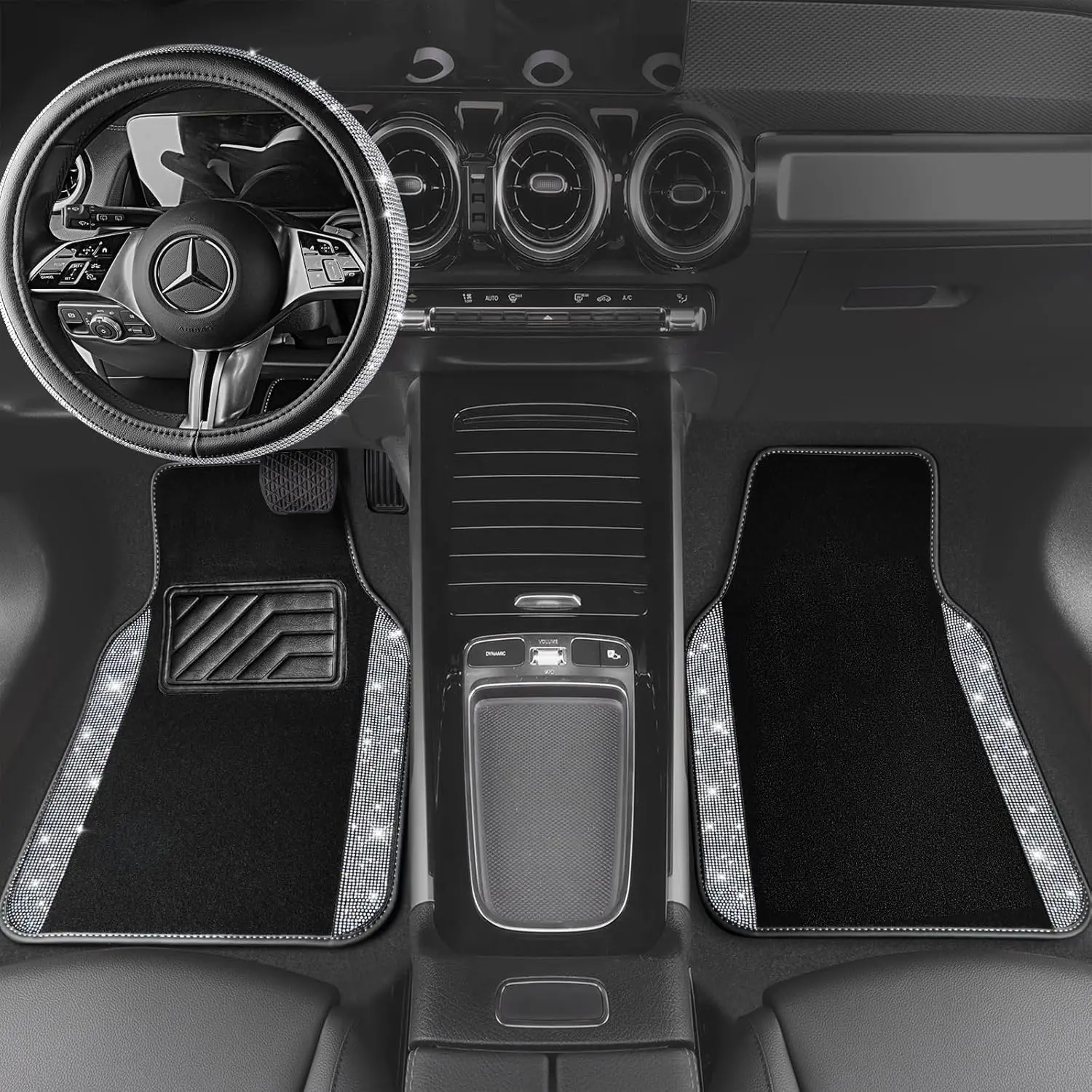 CAR PASS Bling Diamond Leather Steering Wheel Cover 14.5in-15in Floor Mats Shining Rhinestone Carpet Sparkly Glitter Crystal Anti-Slip Pad Fit Automotive SUV Pickup Truck Girl Women, 5pcs Black Sliver