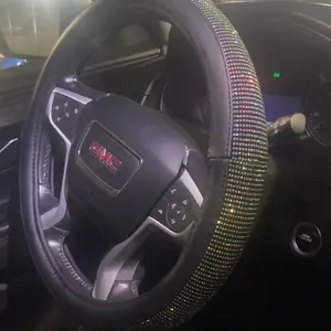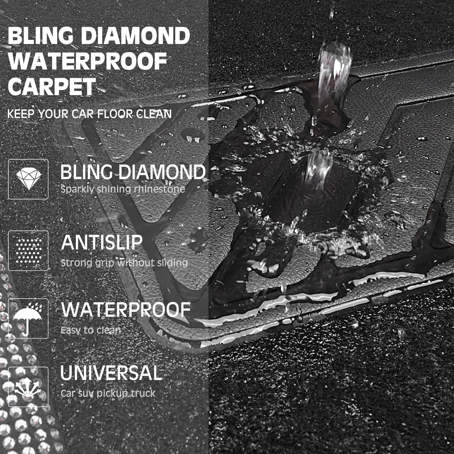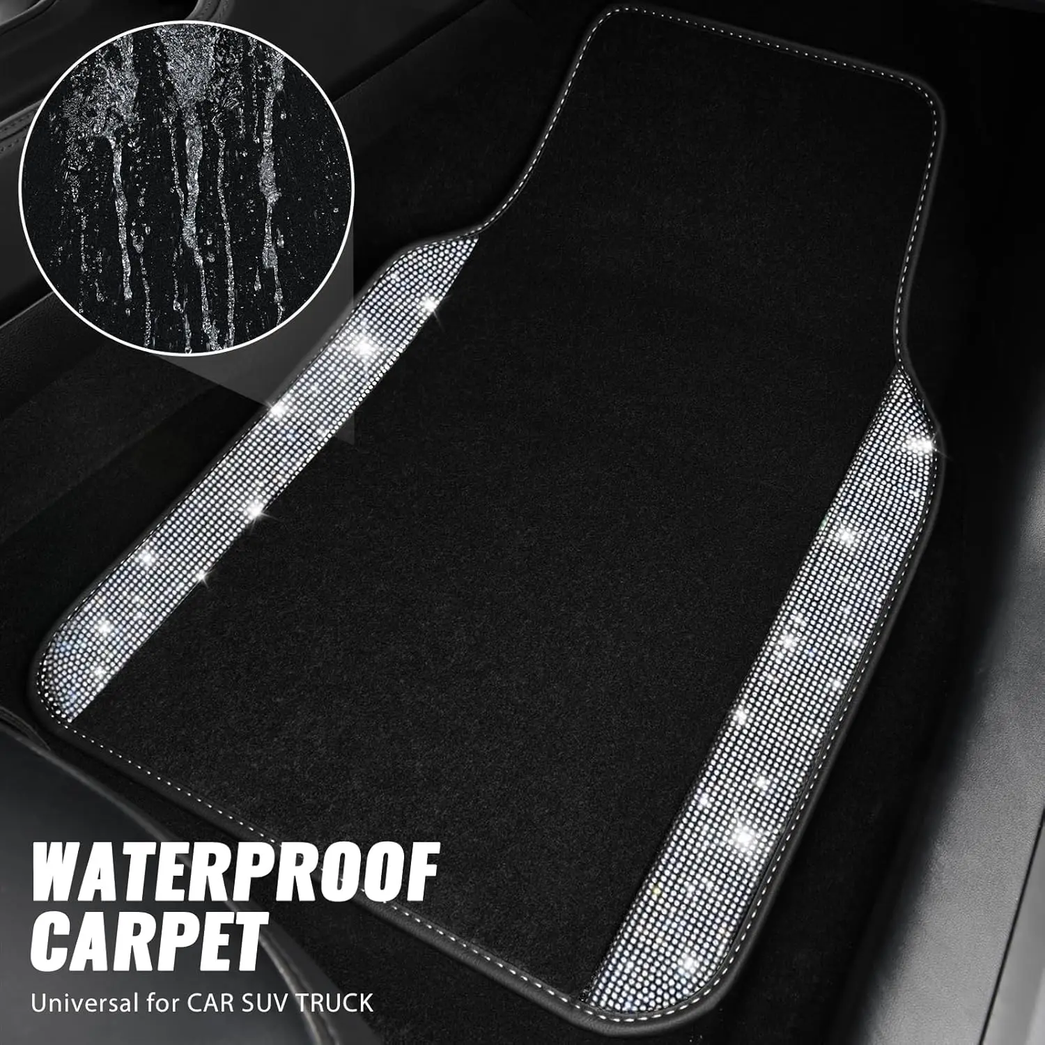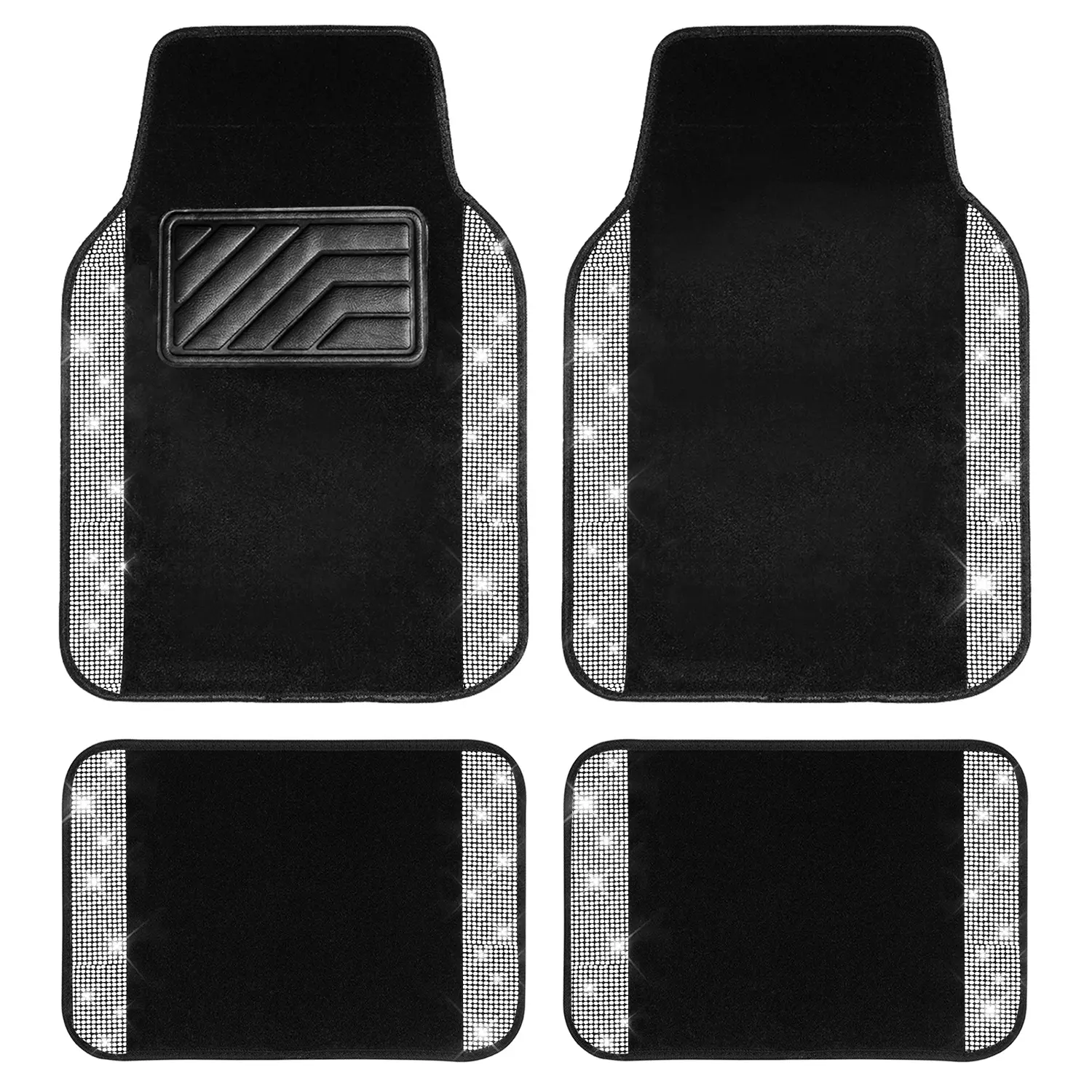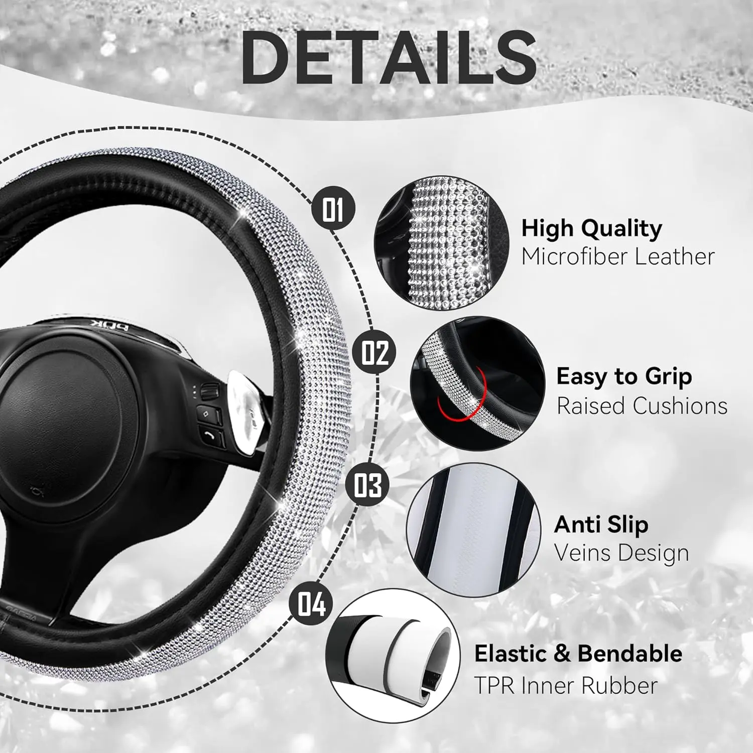 CAR PASS Bling Diamond Leather Steering Wheel Cover 14.5in-15in Floor Mats Shining Rhinestone Carpet Sparkly Glitter Crystal Anti-Slip Pad Fit Automotive SUV Pickup Truck Girl Women, 5pcs Black Sliver