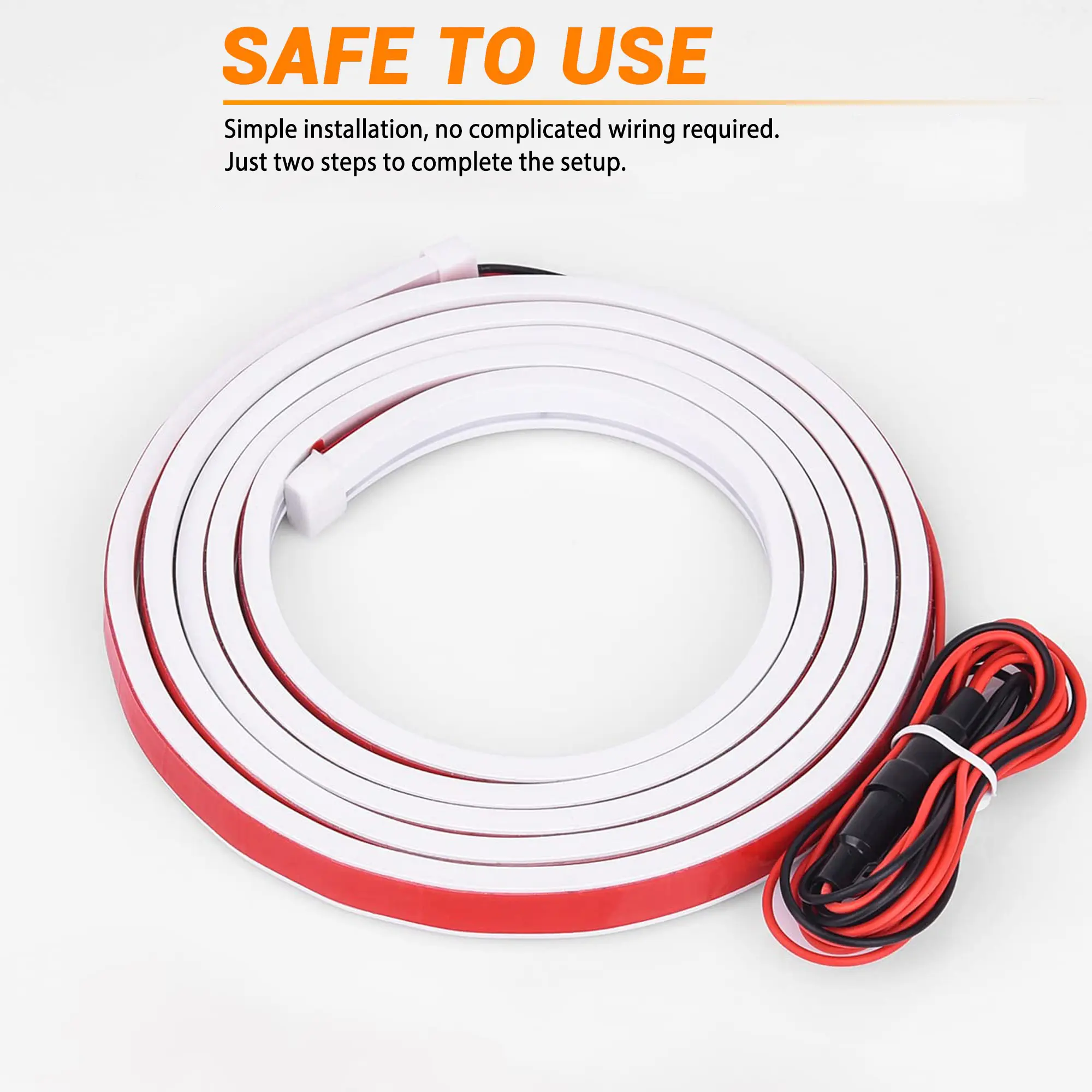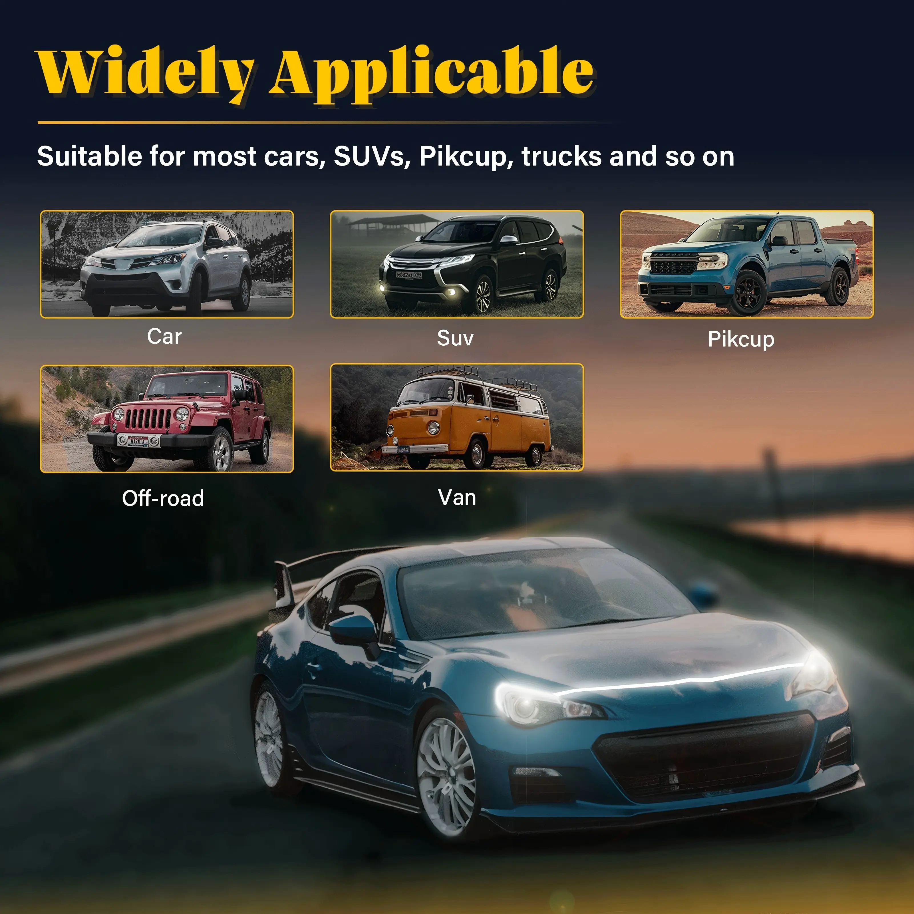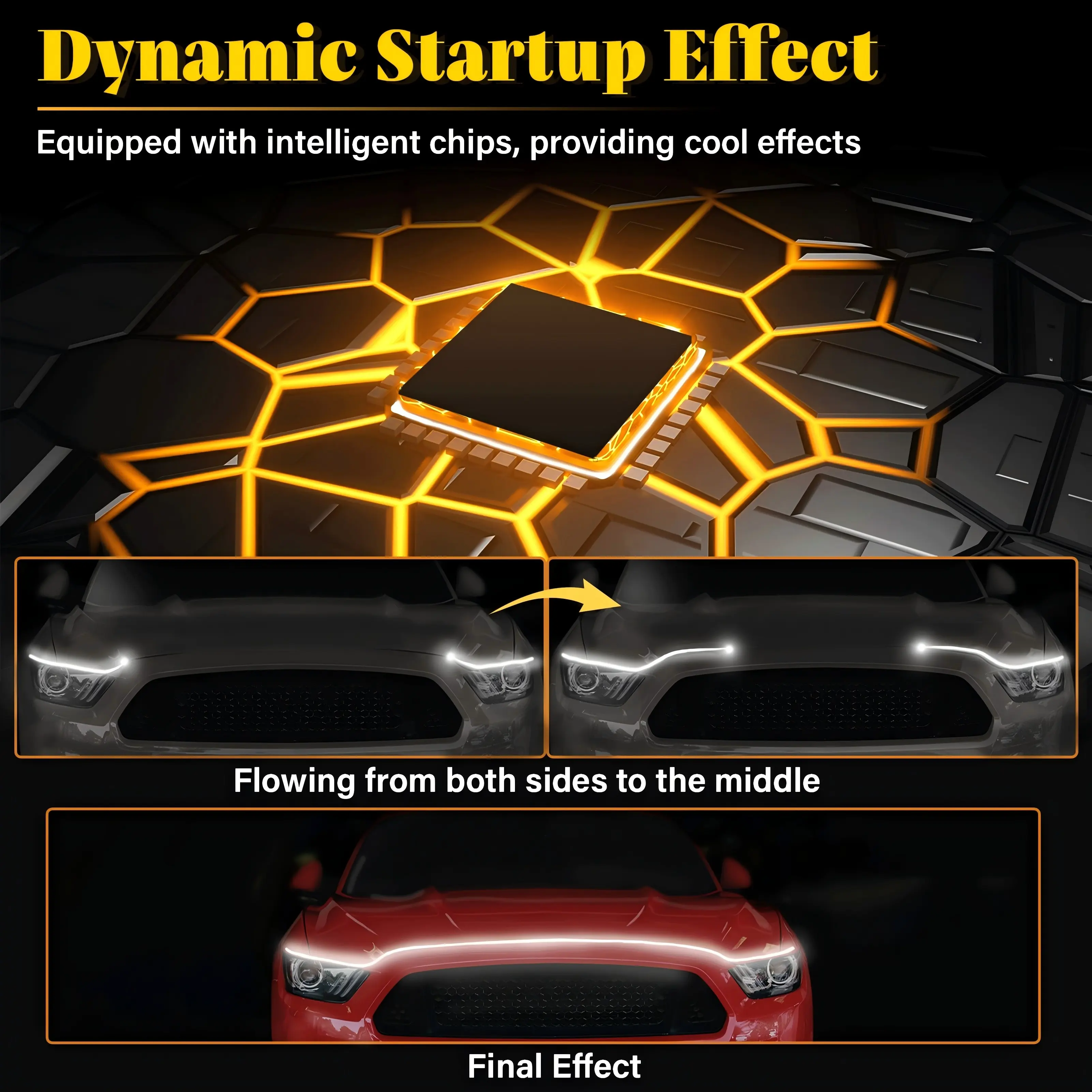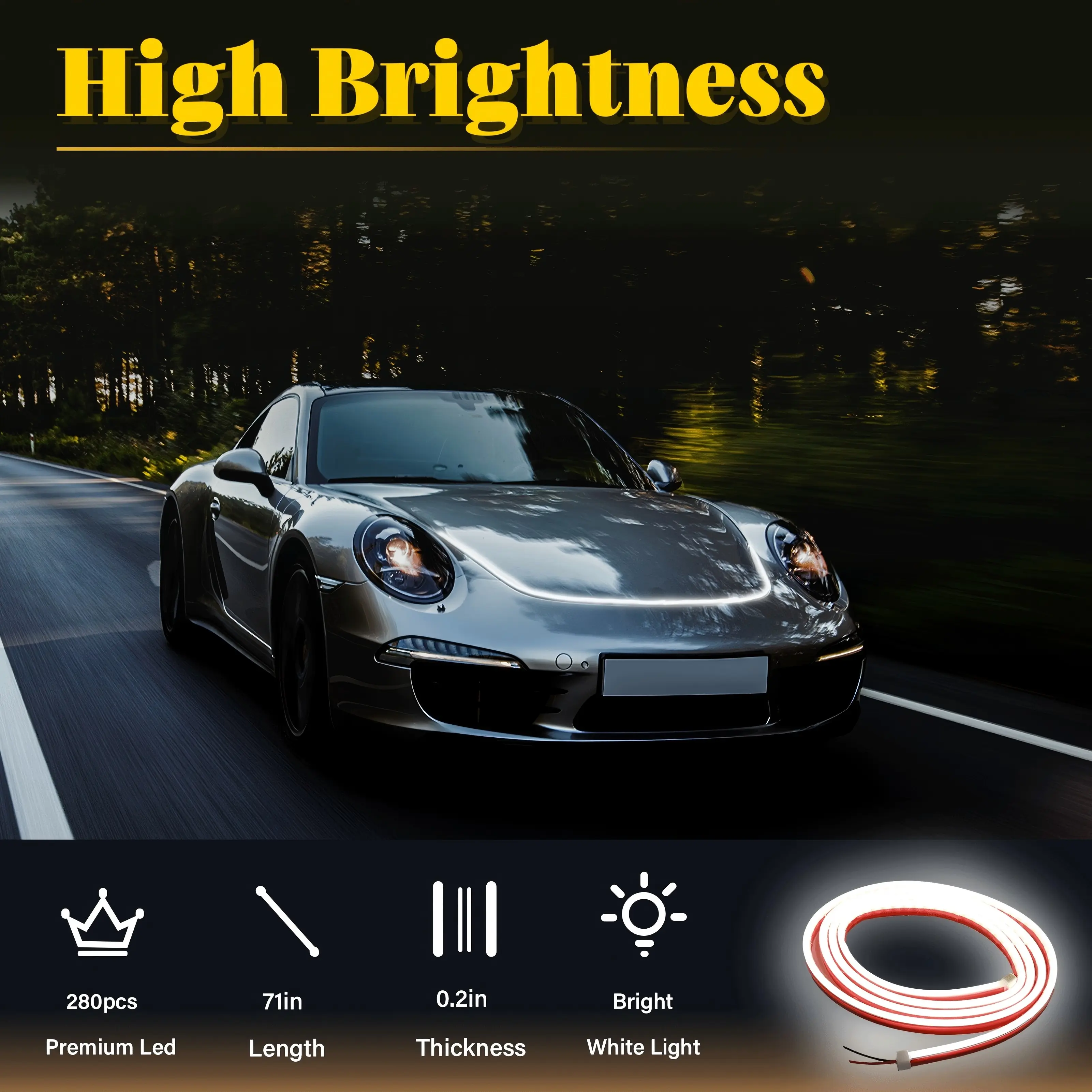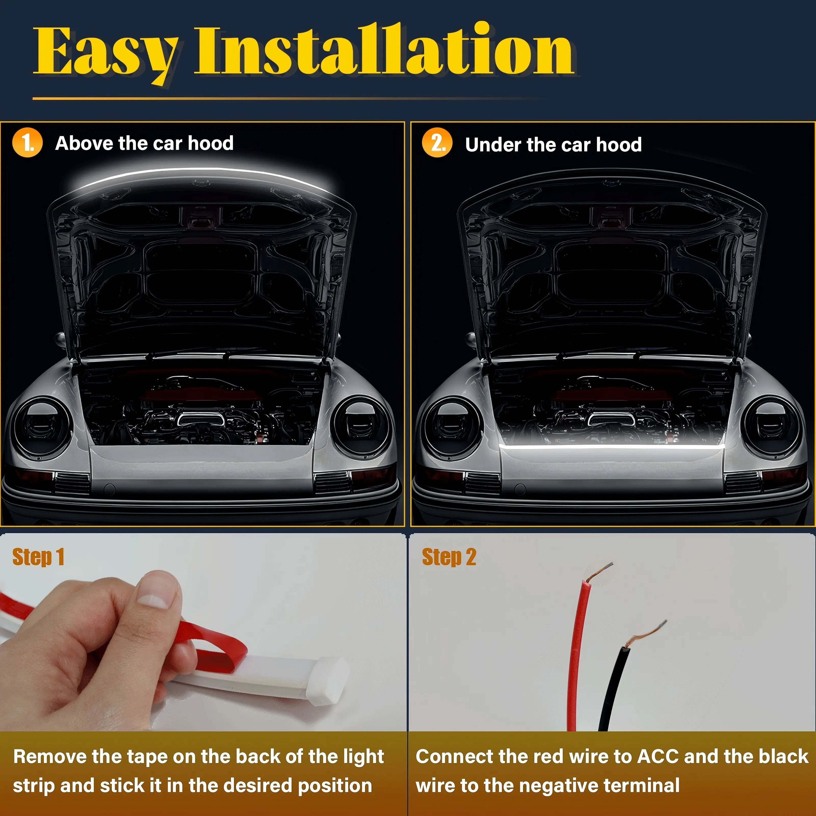 This DIBMS 71" LED strip offers dynamic scanning activation, making your car cooler. The LED beads, 2835 high-quality lamps, provide super brightness. Perfect for nighttime driving, it increases illumination and ensures safety. The strip is easy to install with super glue on the back, attaching effortlessly to the hood gap. The red wire connects to ACC, and the black wire to the negative pole.