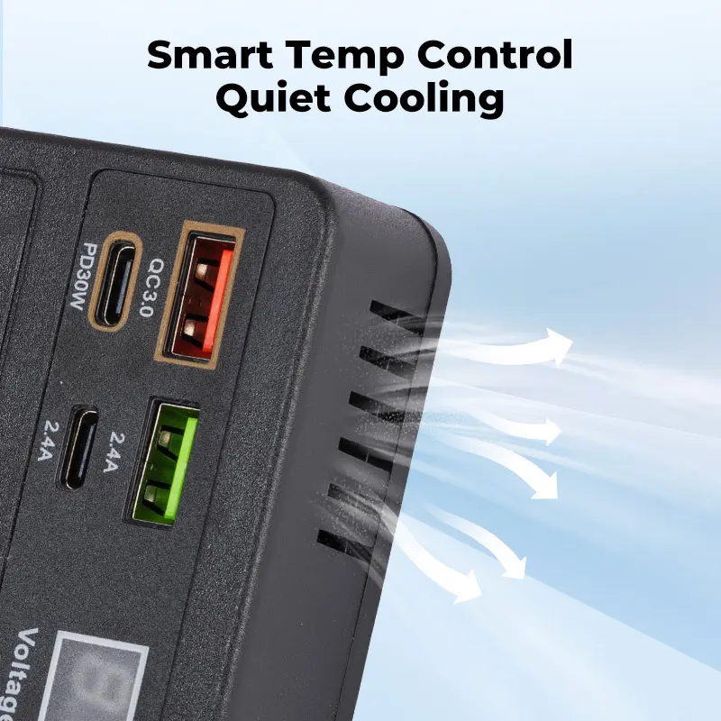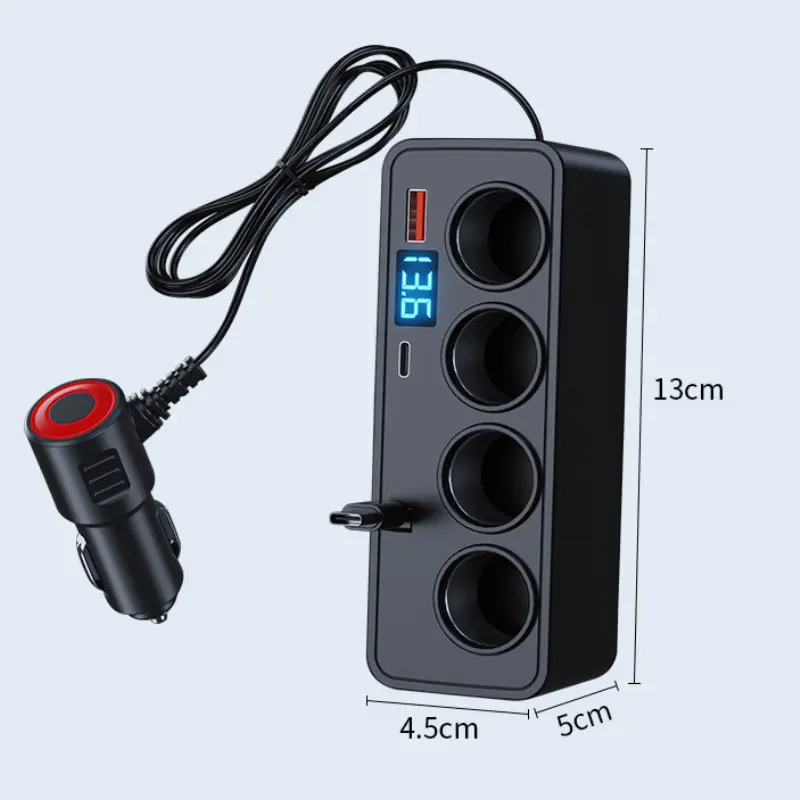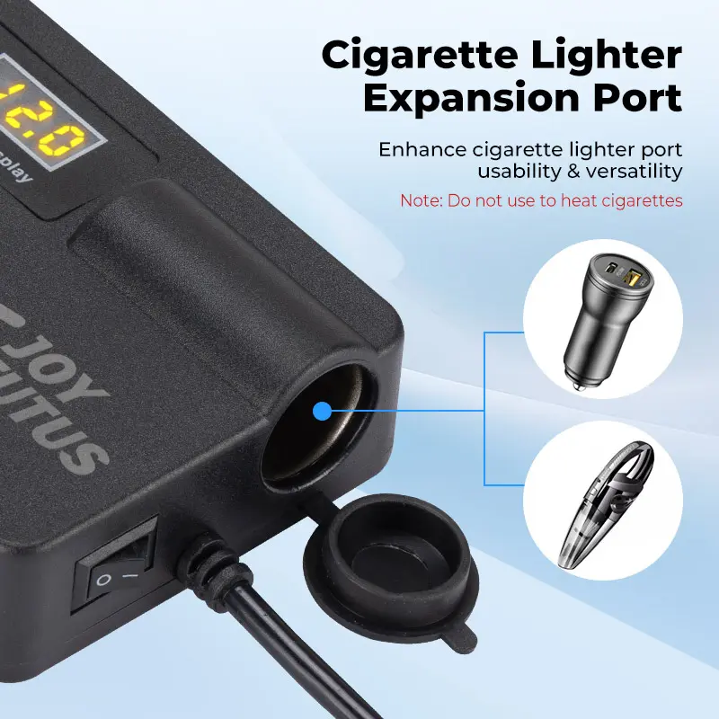 Supports QC3.0 fast charging for laptops, tablets, and phones. The independent switch offers dual protection, safeguarding devices and the car battery. Intelligent constant-temperature control ensures high efficiency and stability. The cigarette lighter port is for charging only, not for lighting.
