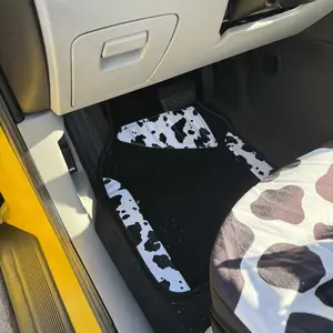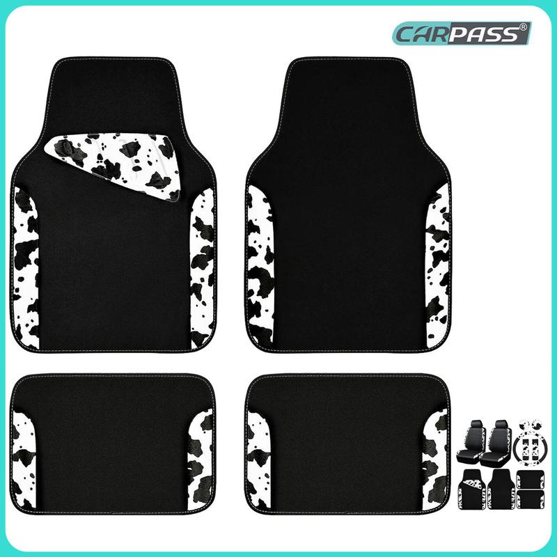 CAR PASS Cow Print Car Accessories Sets Faux Leather Car Seat Covers & Cow Car Mats & Cow Steering Wheel Cover Seat Belt Pads Universal fit for SUV,Van,Saden,Truck Cute Automobile Interior Sets Women