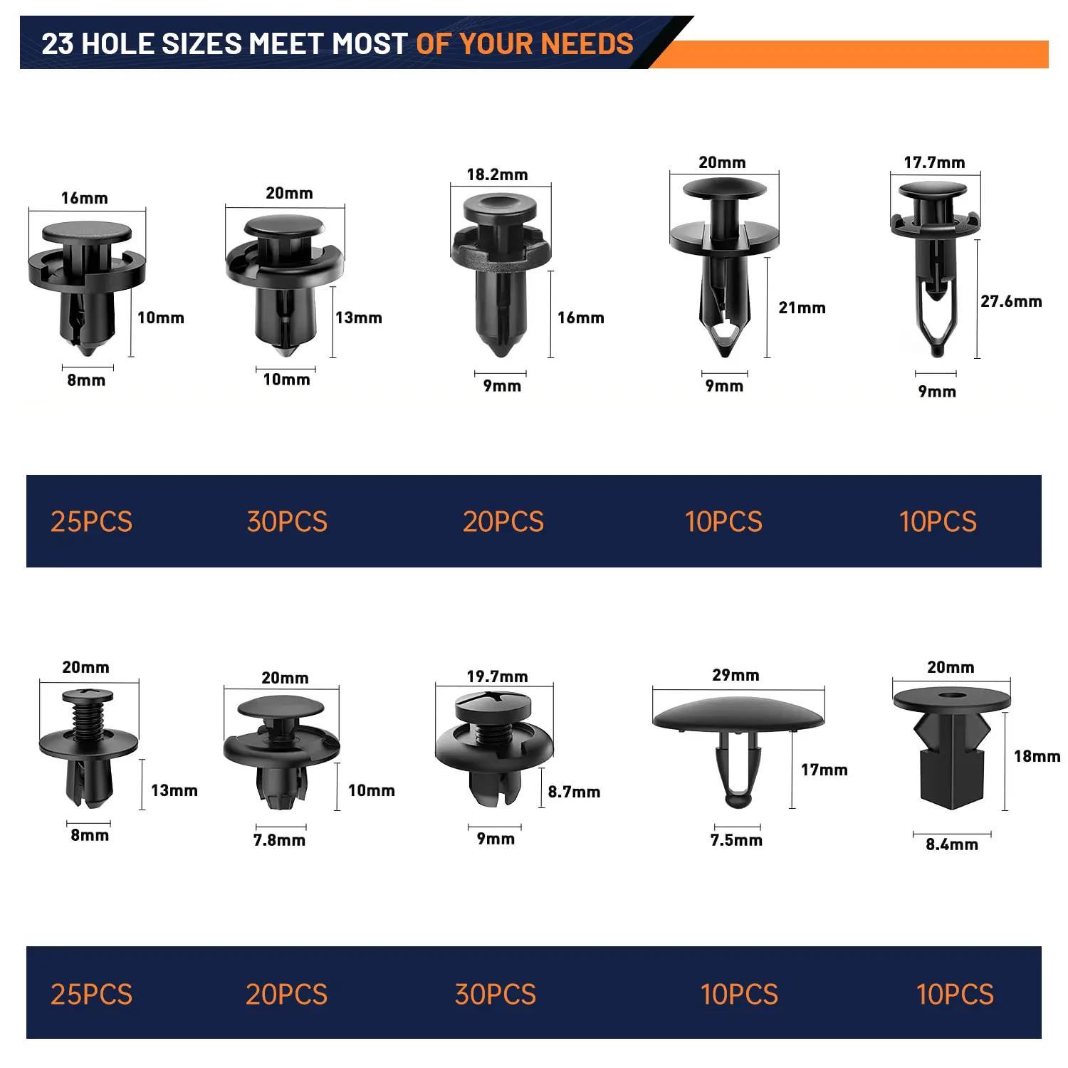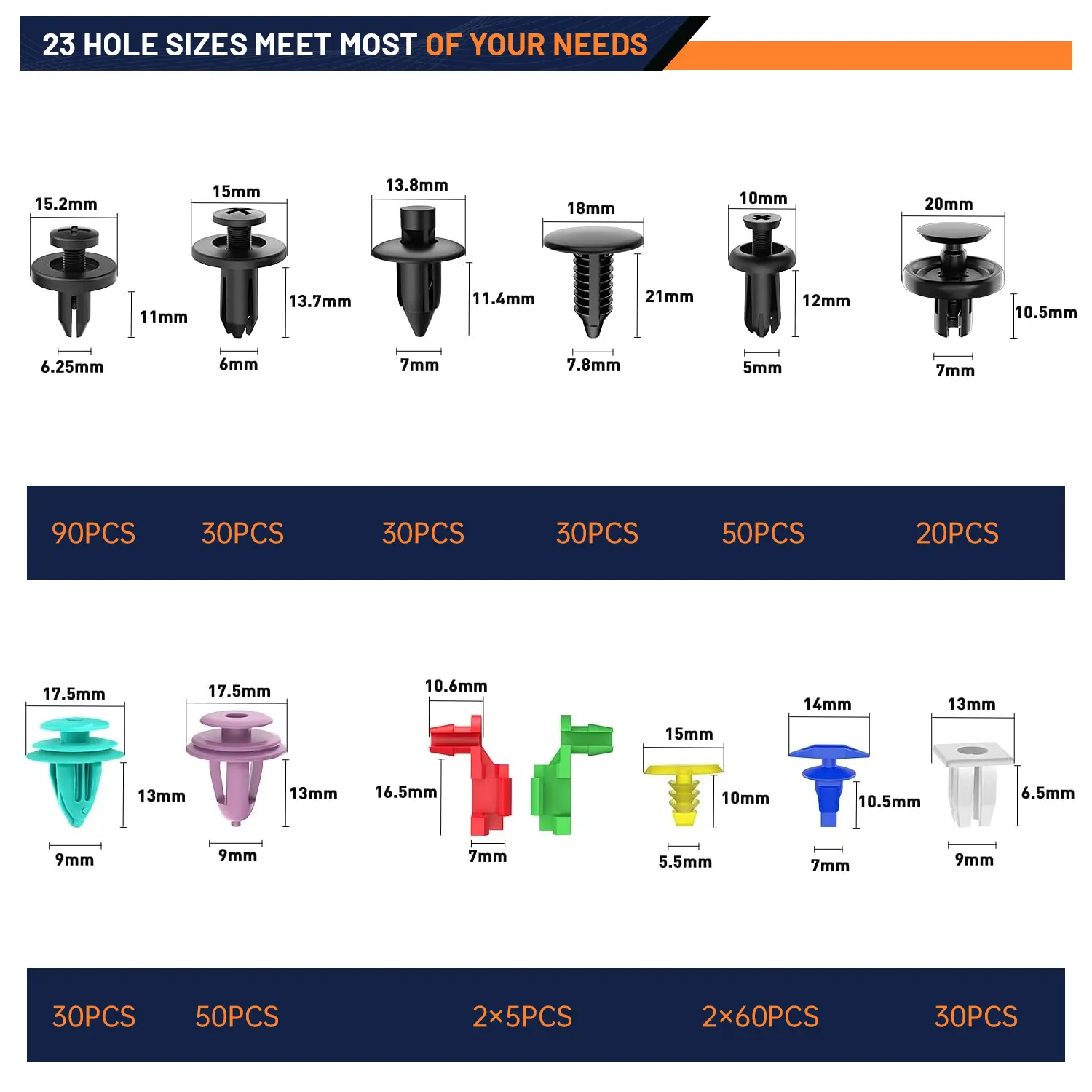 Save Time & Money:This 725-piece push-on fastener kit includes all the clips you need to replace broken or missing ones. One box saves you the cost of multiple parts at auto shops and at least two hours per repair.
