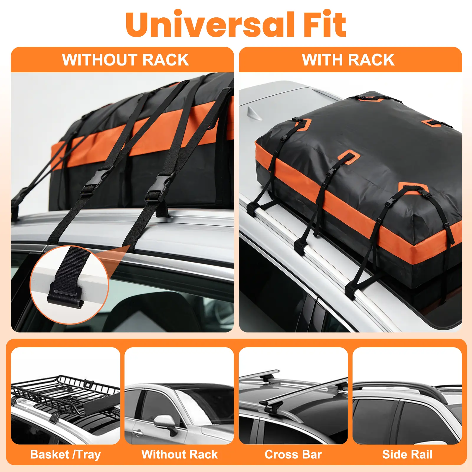 ·Universal Fit & Easy Setup: Car roof cargo carrier can fit most roofs with crossbars/side rails/baskets or bare tops without racks; fit most size vehicles such as Sedan, SUV, Truck, station wagons, hatchbacks, hardtop crossovers. Quick installation, folds compactly into included storage bag.