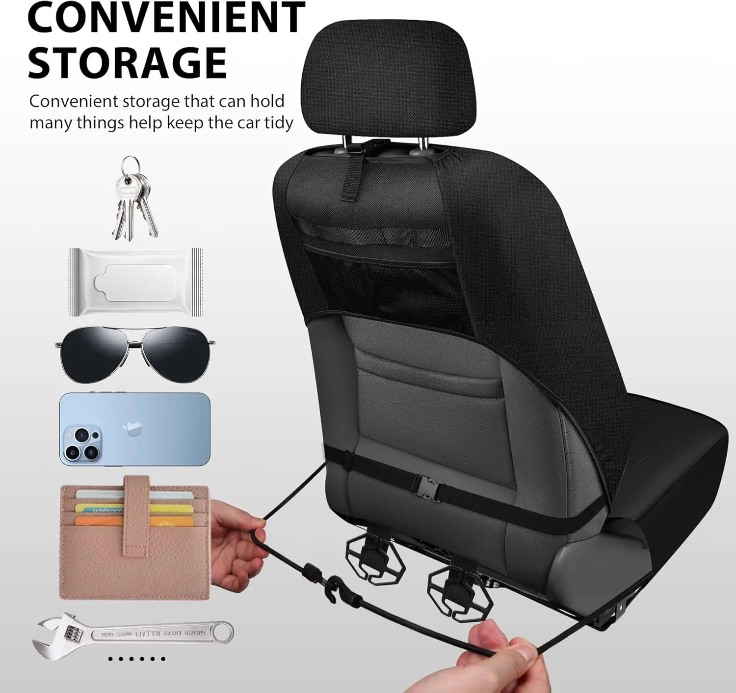 The back of the seat cover with tool storage bags, easy to organize your car.