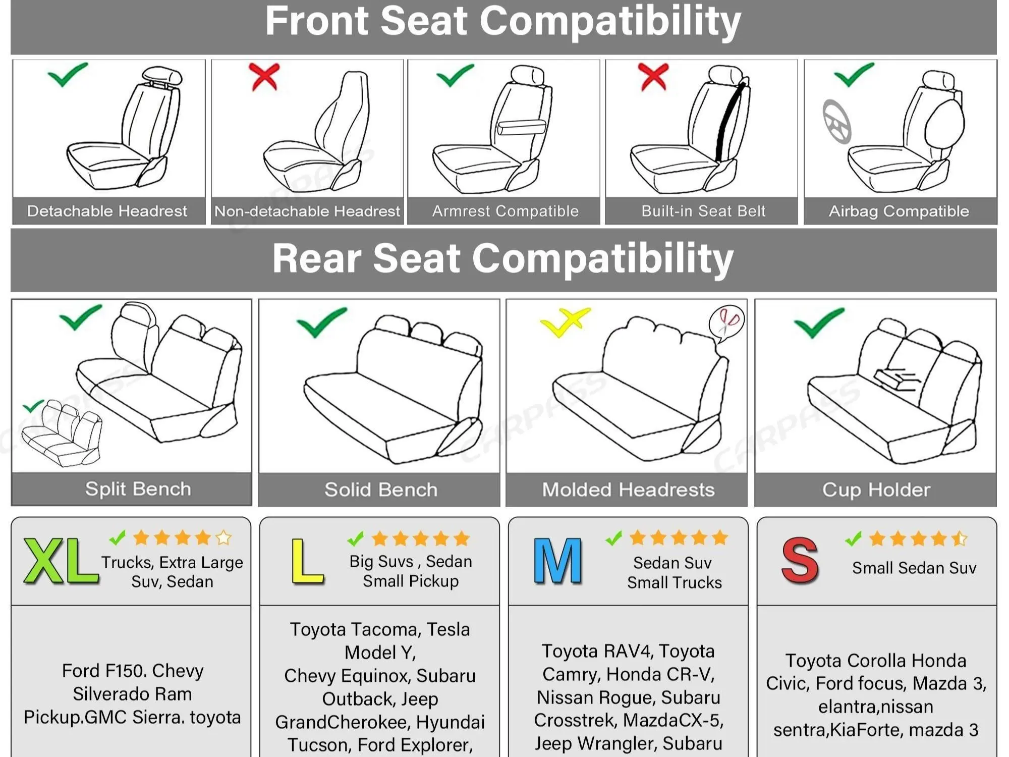 CAR PASS Universal Car Seat Covers are compatible with most cars, sedans, trucks, pick-ups and SUVs