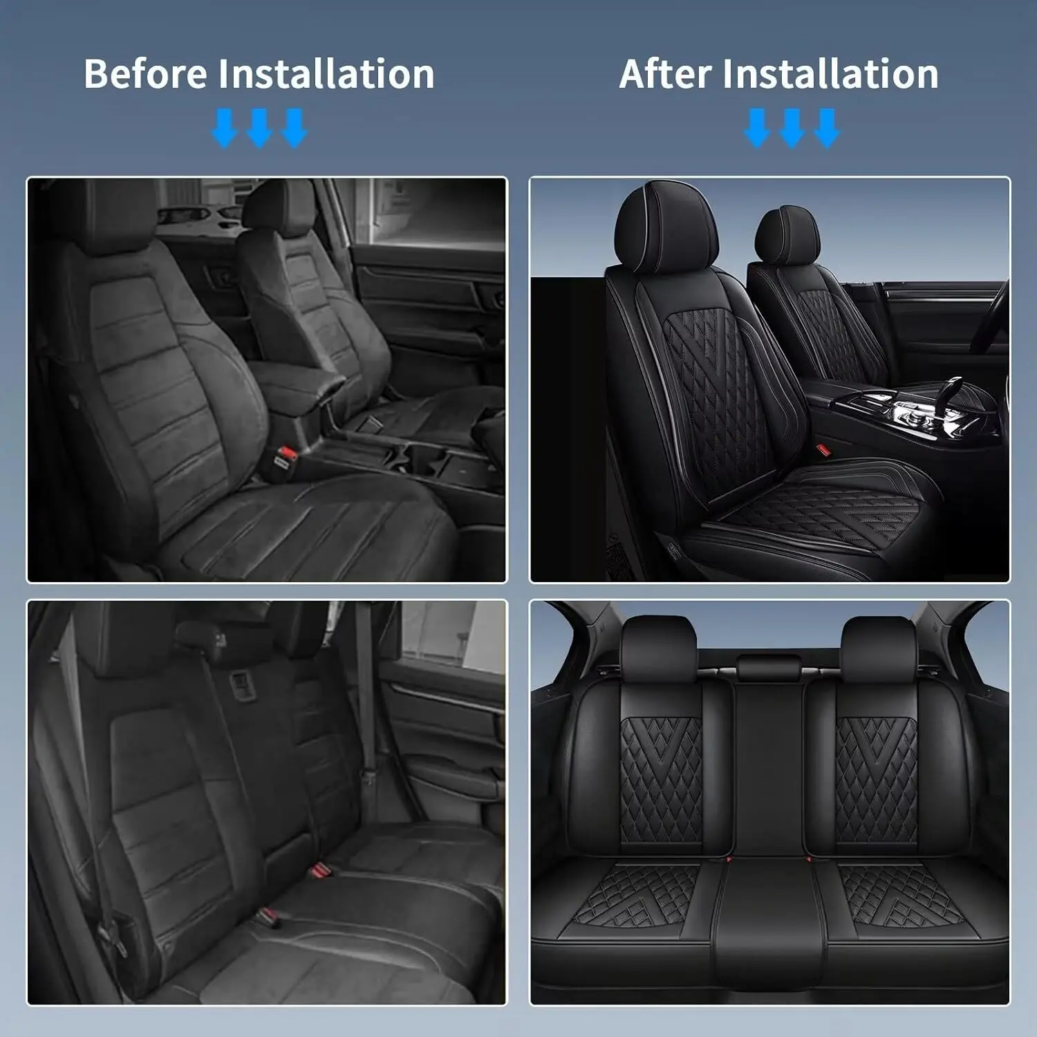 【PU Leather】Faux leather seat cover protects the seat from splashes, stains, pet hair and harmful ultraviolet rays, waterproof and scratch-proof. The front seat cover is fully wrapped design. The back of the front headrest and the side of the seat cover are made of elastic cloth, which is elastic.