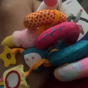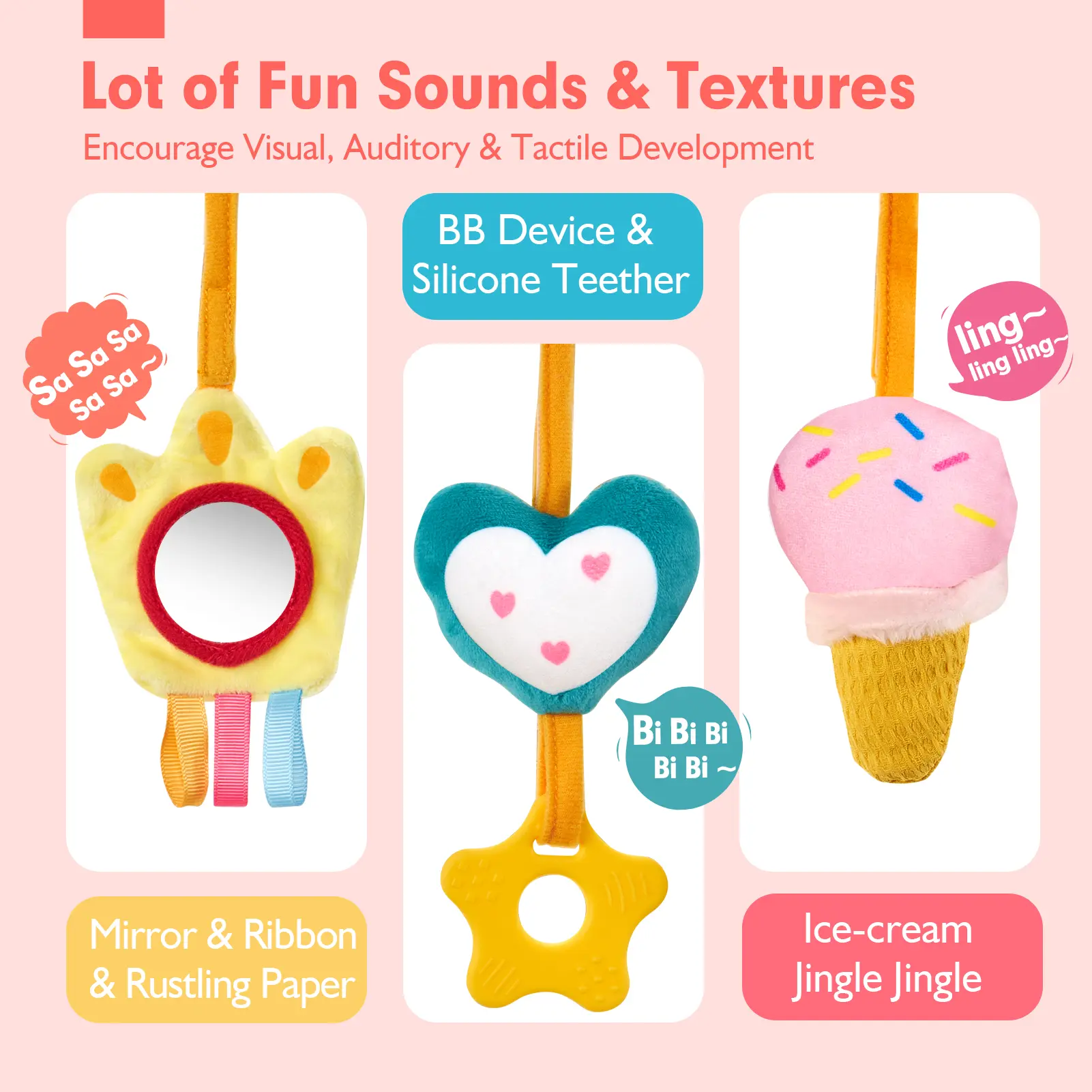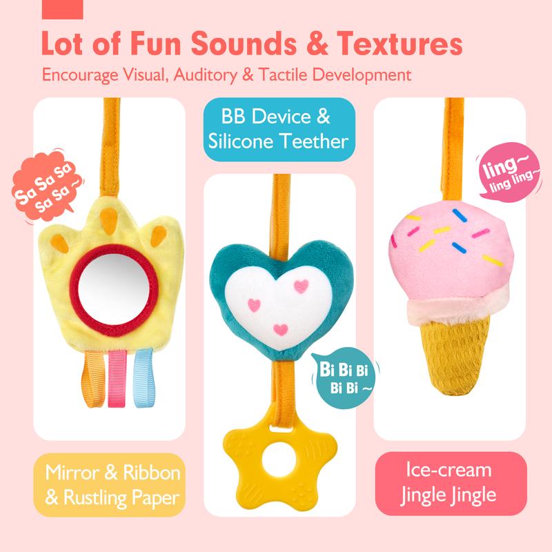LOTS OF FUN SOUNDS and TEXTURES KEEP BABY ACTIVE and BUSY FOR LONG HOURS: There are three hanging plush toys - a paw, a heart and an ice-cream. The paw crinkle with a baby-safe mirror and colorful ribbons, helps baby identify with the concept of self. The heart with the BB squeak sounds make it perfect to interact with babies, the soft teether soothe their gums. The ice cream jingle when shaking it, they can develop their visual, auditory, tactile, hand and eye coordination naturally while playing