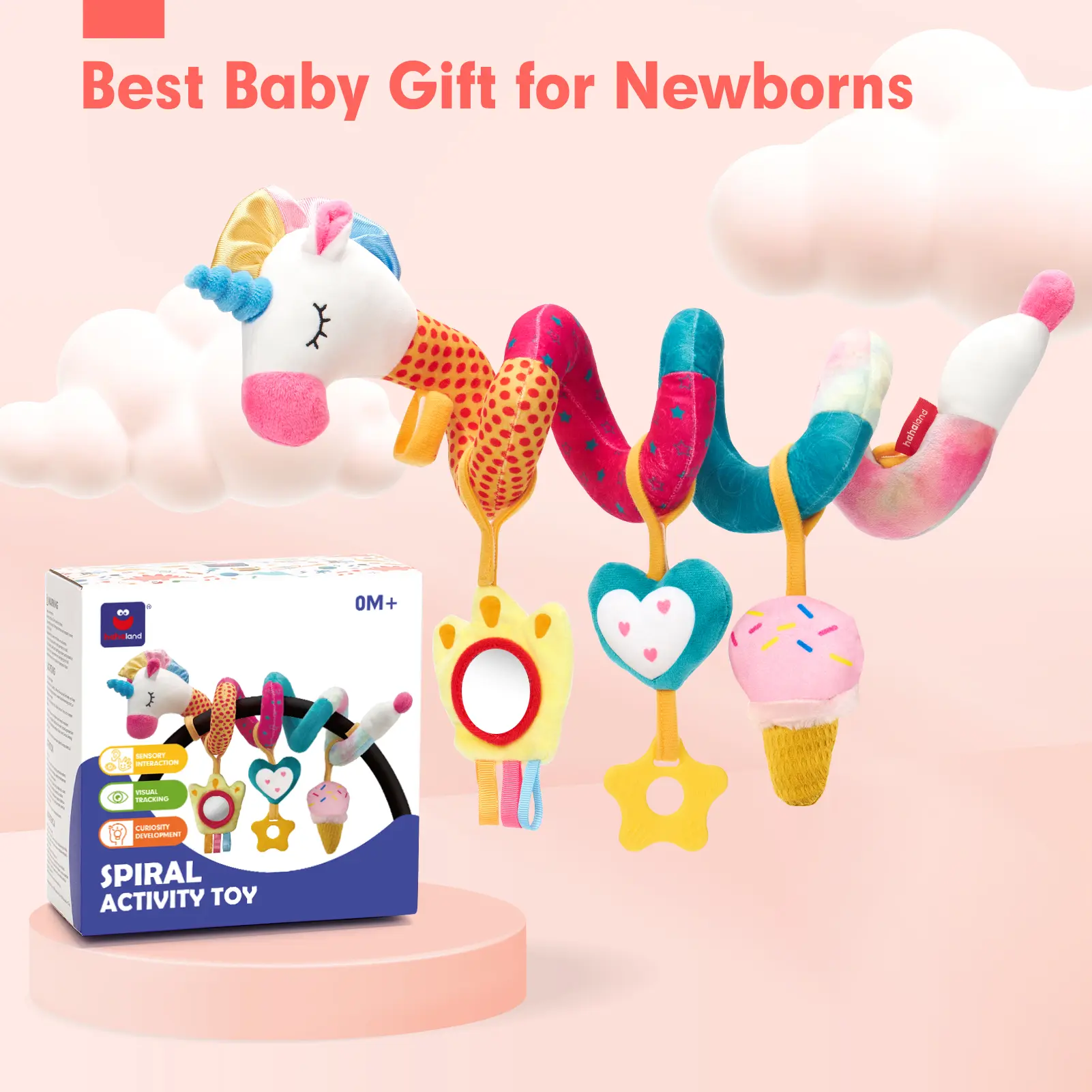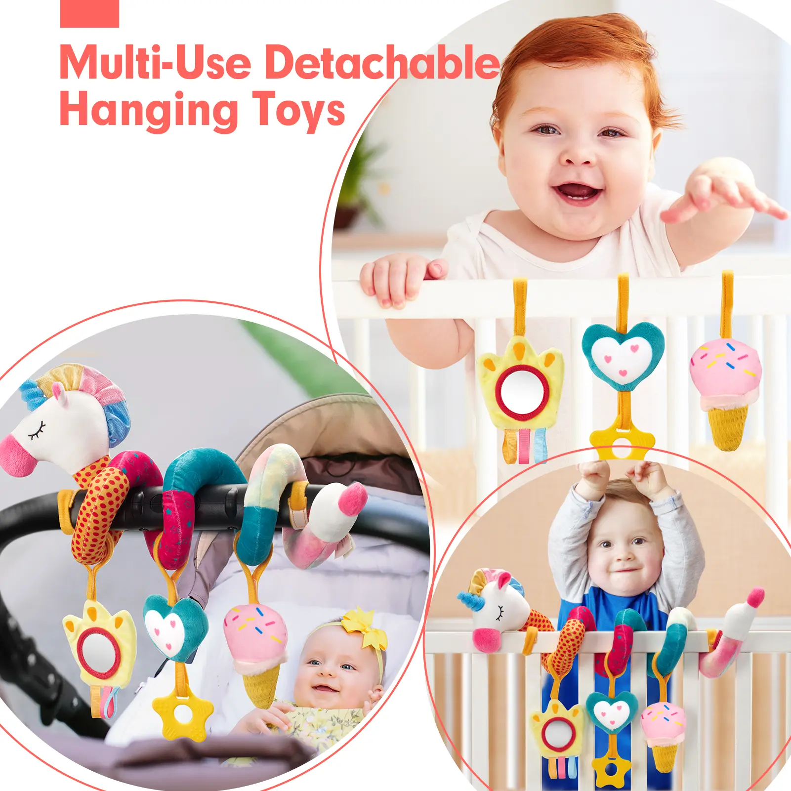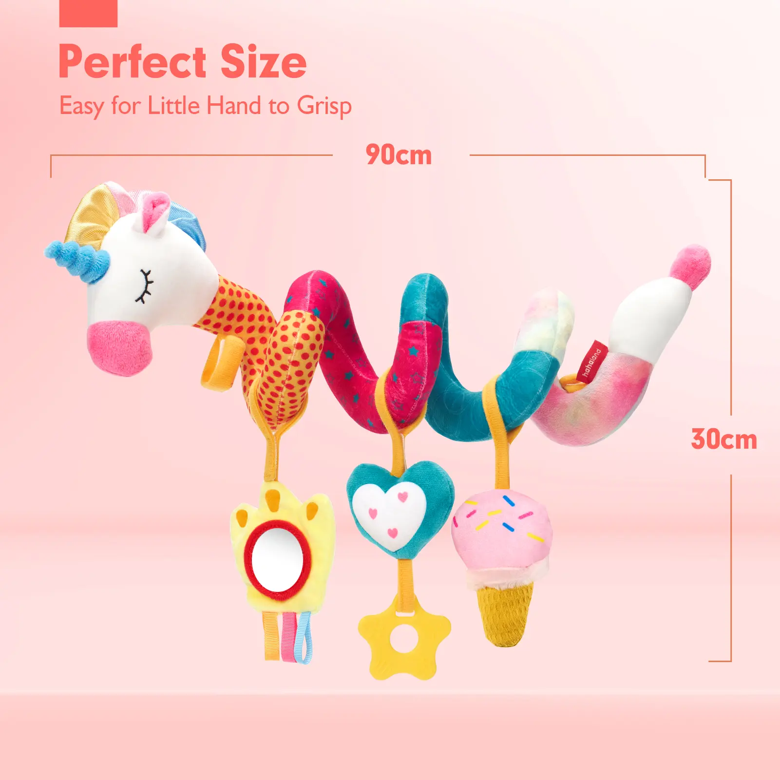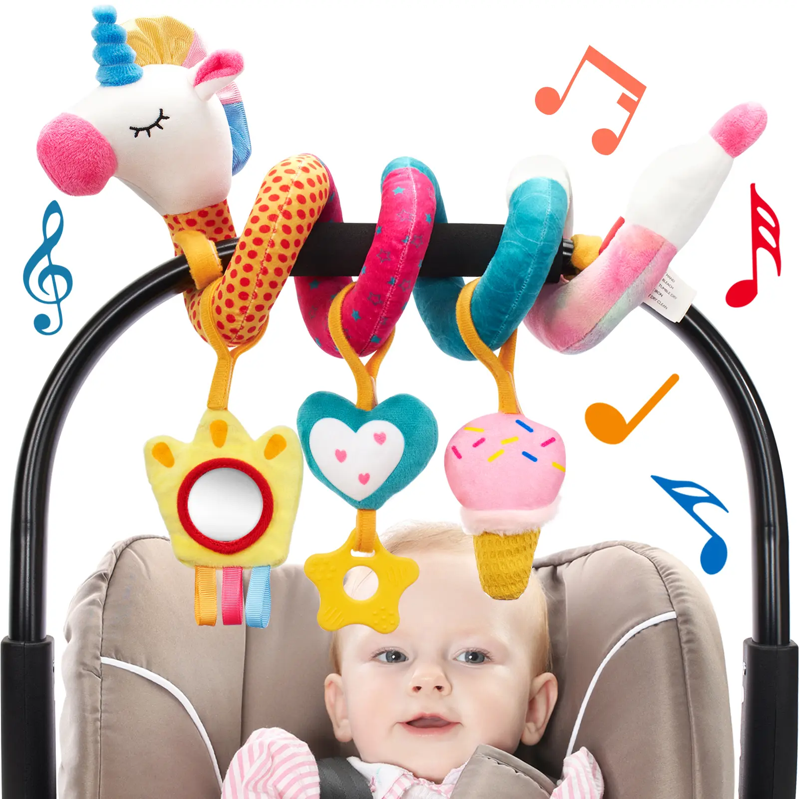 REMAIN STRETCHED and EASILY ATTACHED TO THE CARSEAT: There are Velcro on both sides of the unicorns spiral plush, which make it remain stretched and easily and safely attached to any nursery device with handles and prevents the toys from falling on the baby's face. The interesting patterns, and vibrant colors appealing to the baby and entertain them throughout the long trip and encourage them to explore them more.